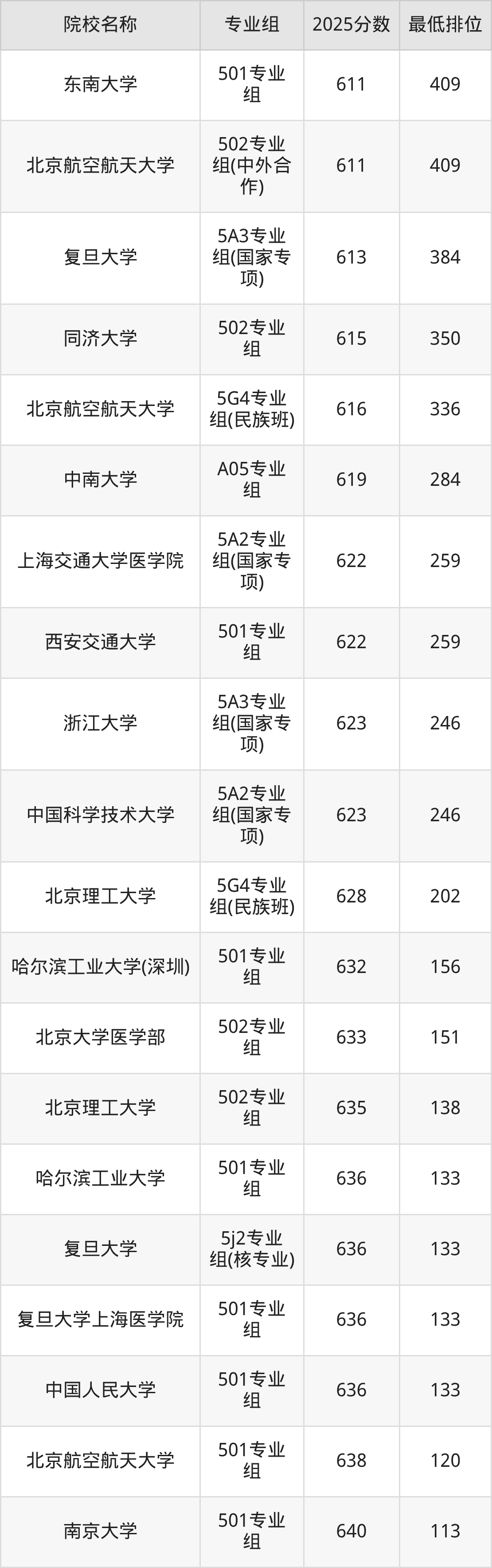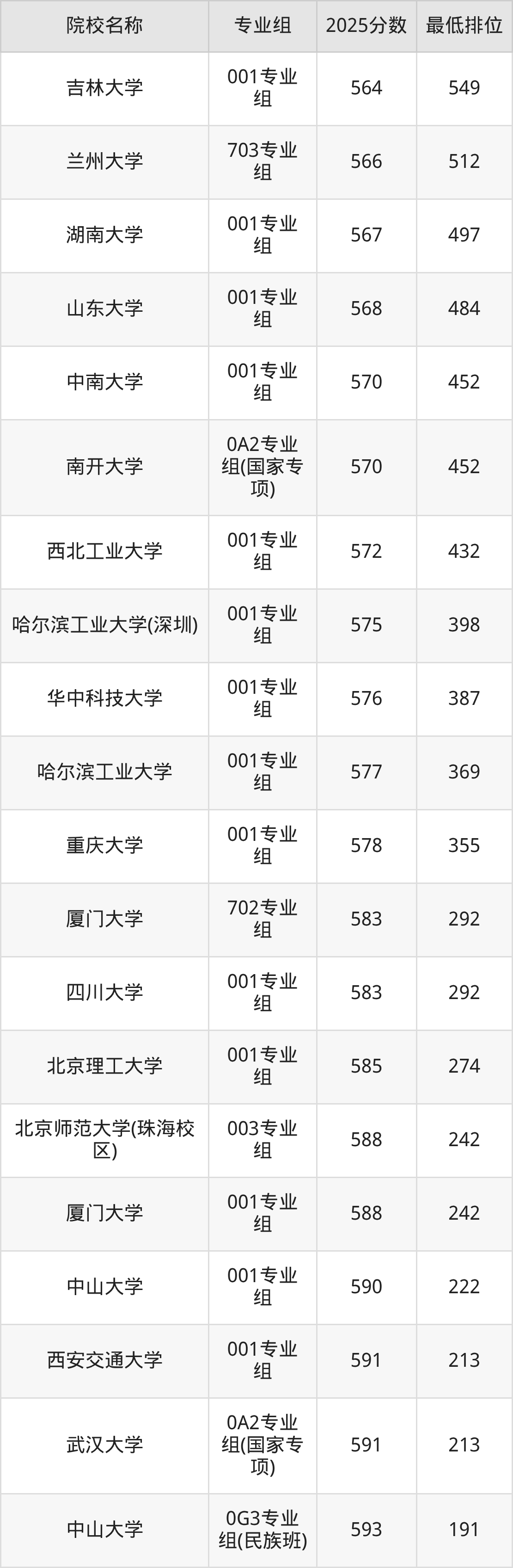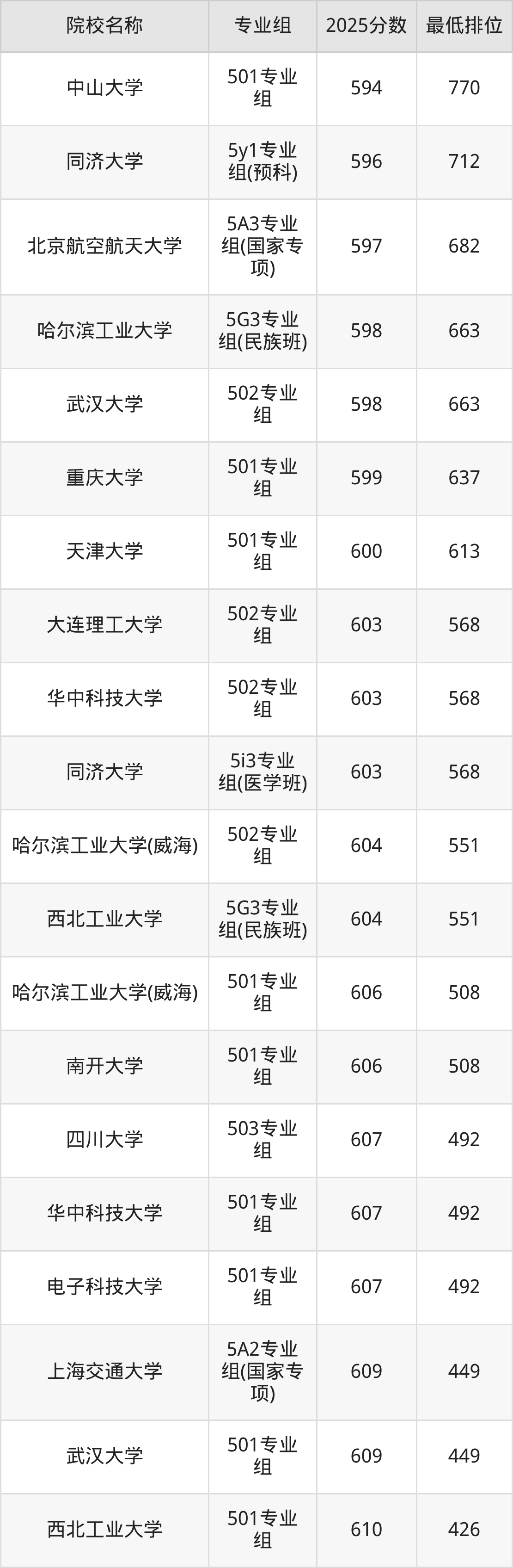 第二梯队(501-659分):四川大学(0e1专业组(预科)是501分)、湖南大学(0A2专业组(国家专项)是504分)、山东大学(5A6专业组(国家专项)是505分)、中南大学(5A2专业组(国家专项)是509分)
