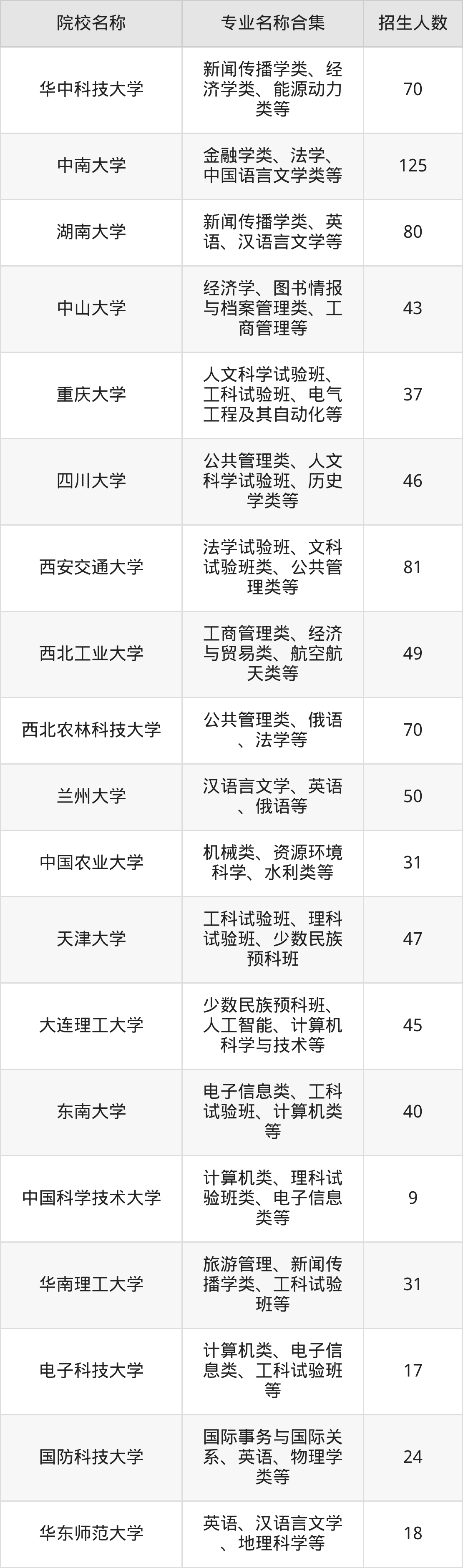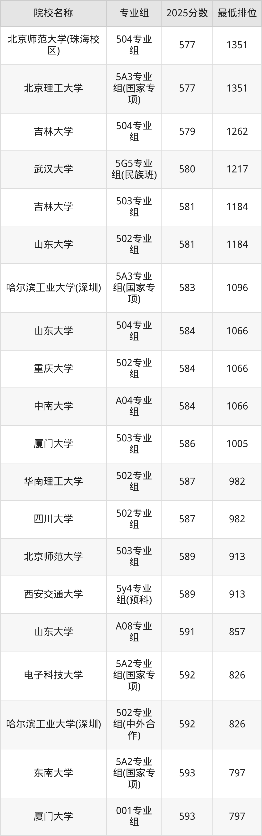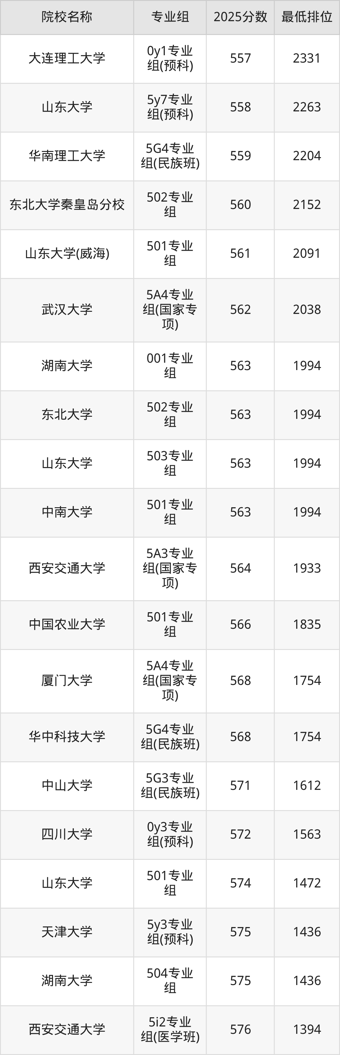 第二梯队(501-659分):四川大学(0e1专业组(预科)是501分)、湖南大学(0A2专业组(国家专项)是504分)、山东大学(5A6专业组(国家专项)是505分)、中南大学(5A2专业组(国家专项)是509分)
