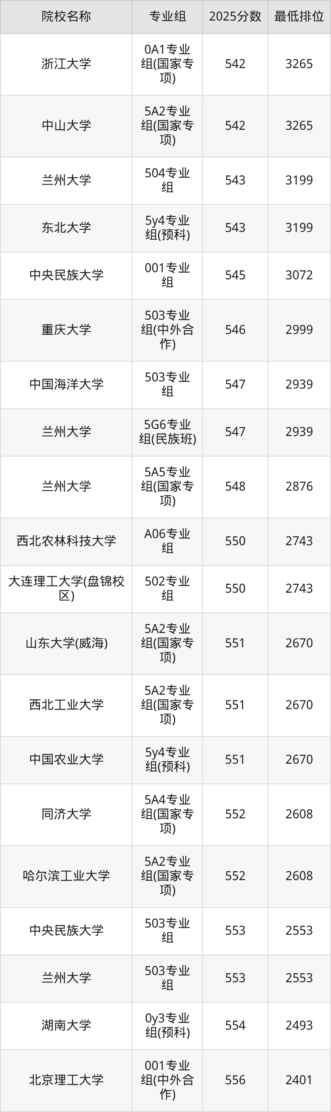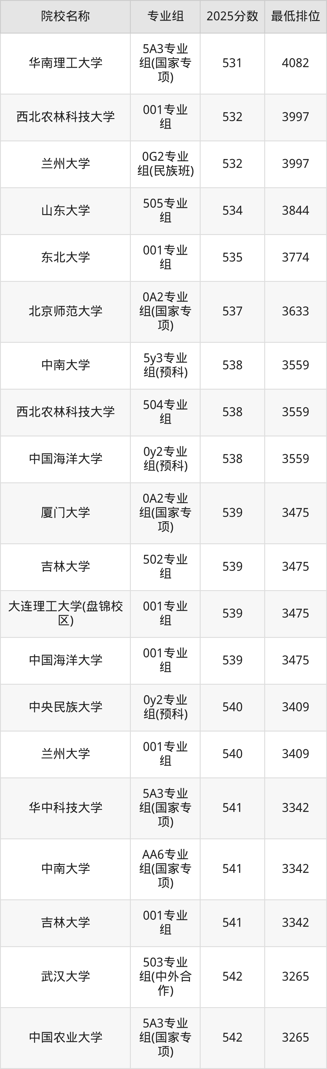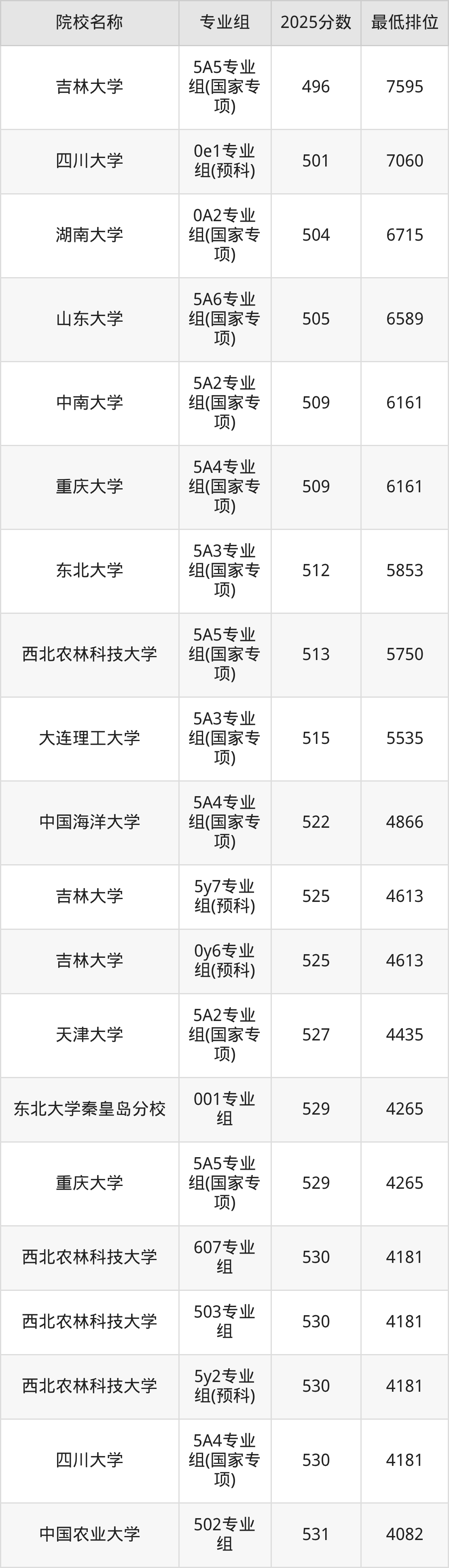 第三梯队(500分及以下):吉林大学(5A5专业组(国家专项)是496分)