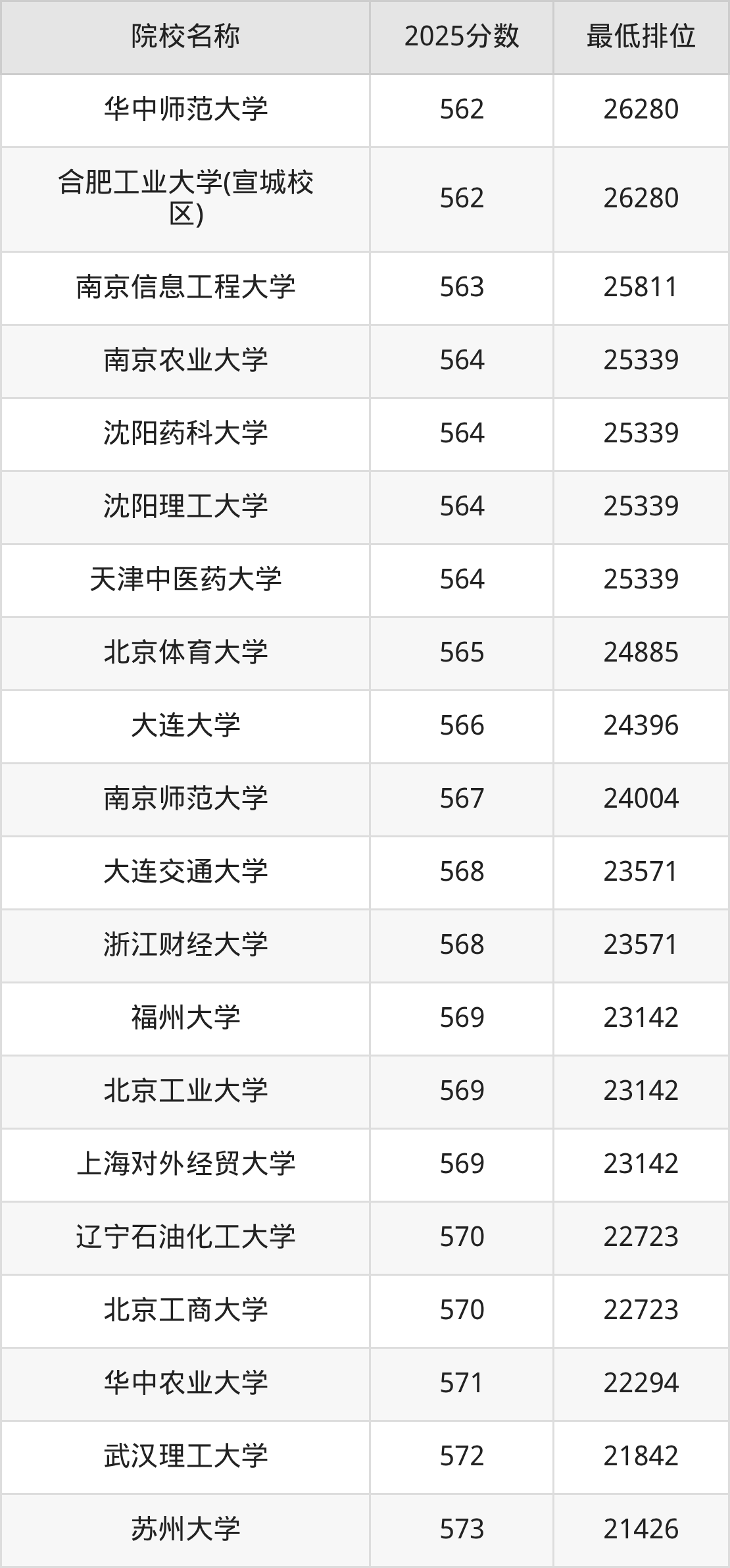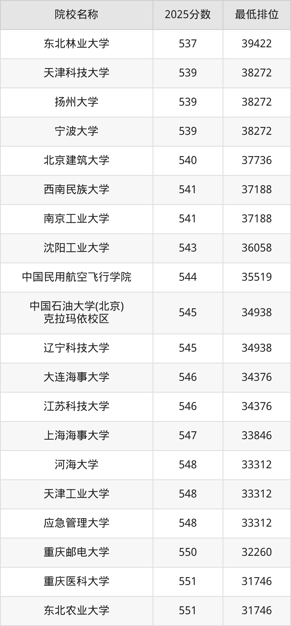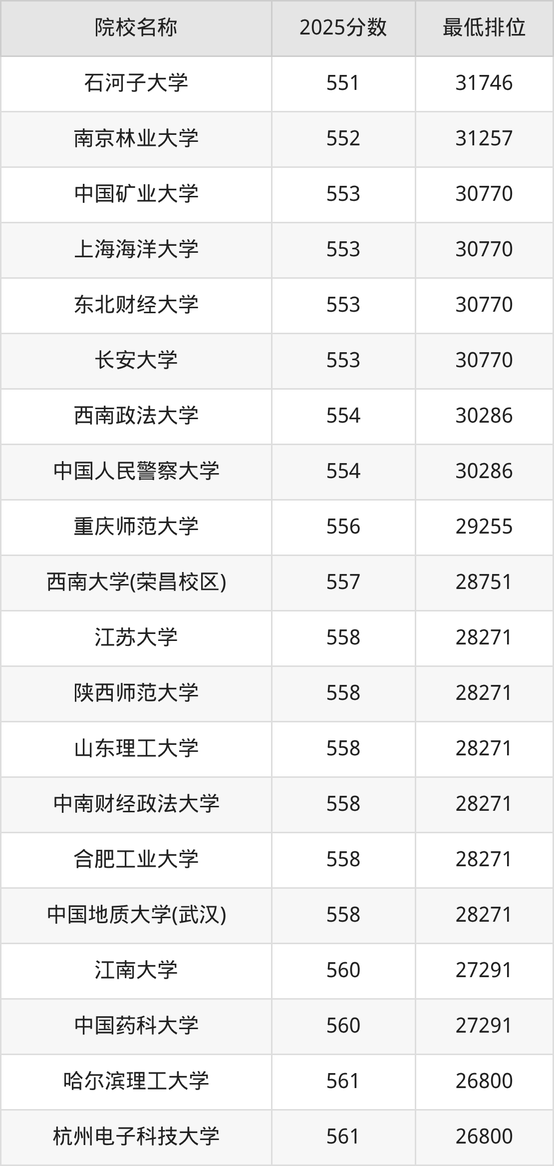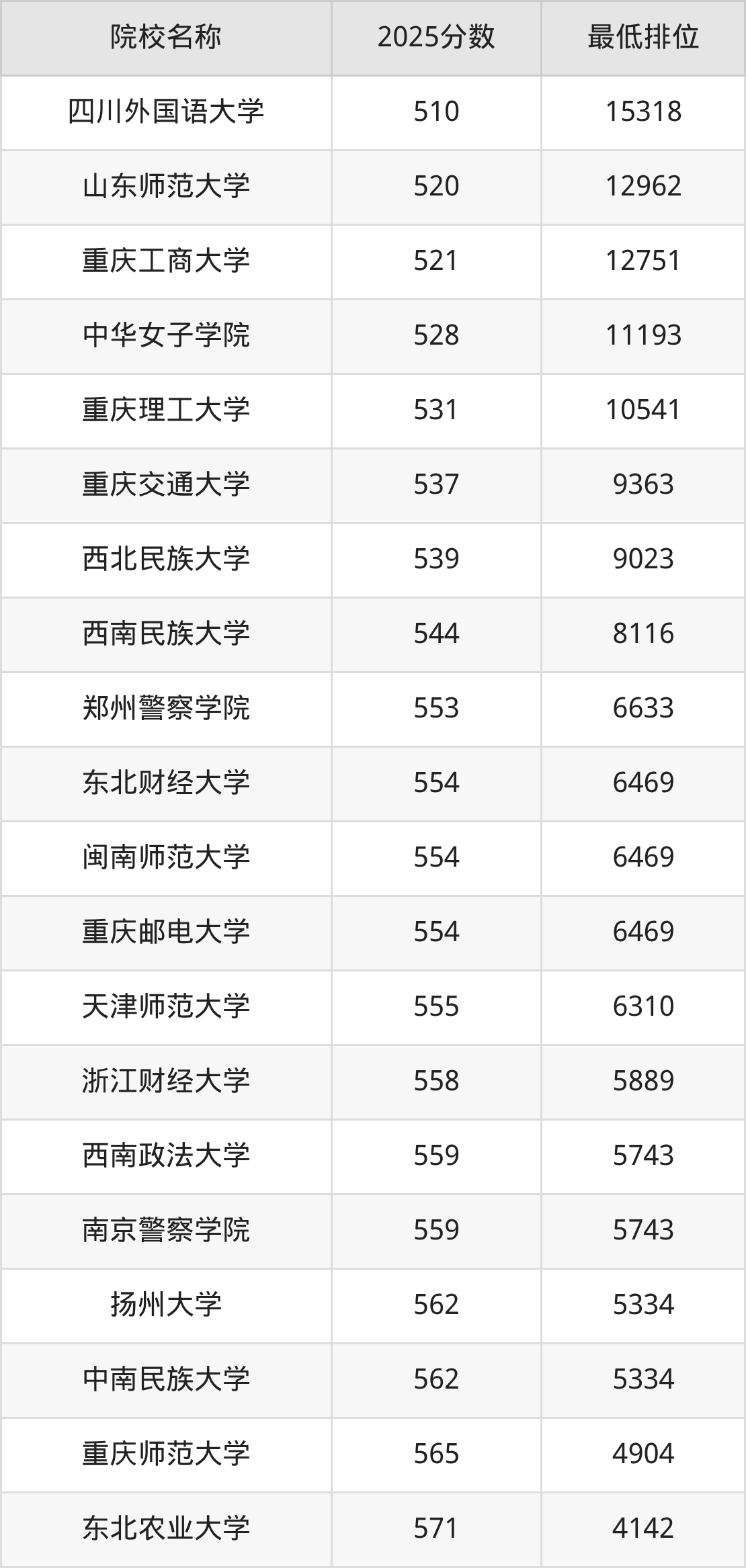 第二梯队(521-649分):重庆工商大学(521分)、中华女子学院(528分)、重庆理工大学(531分)、重庆交通大学(537分)