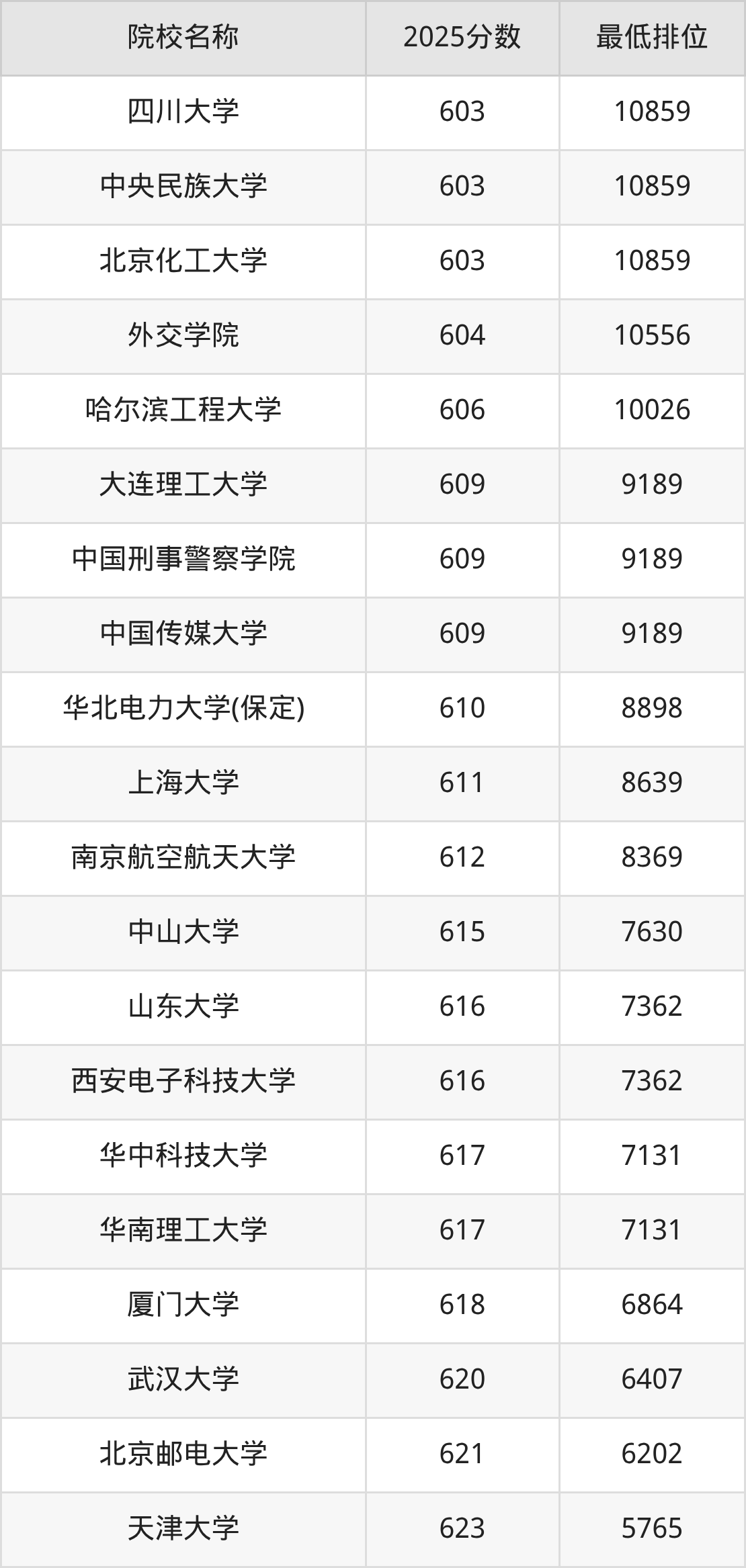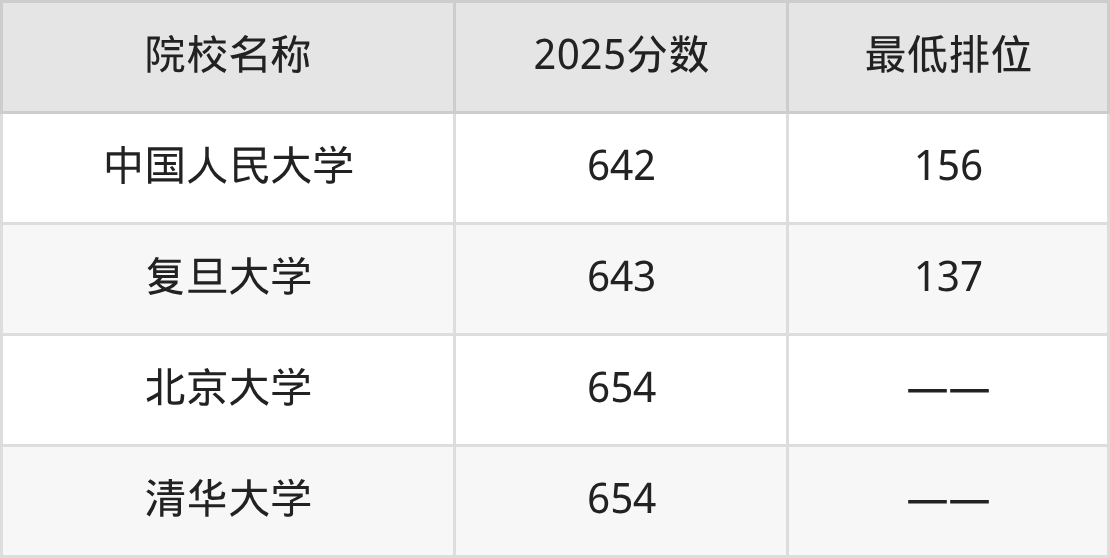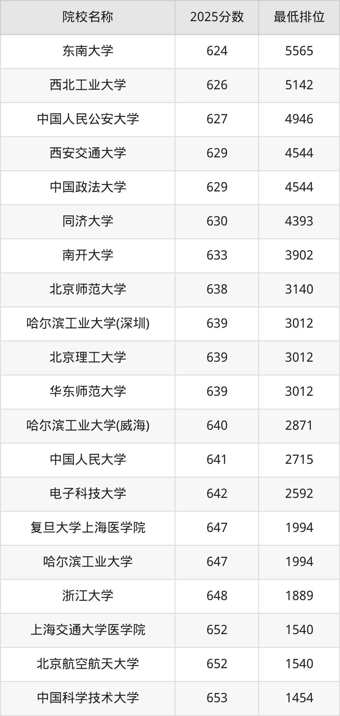 第一梯队(650分+):北京大学(654分)、清华大学(654分)
