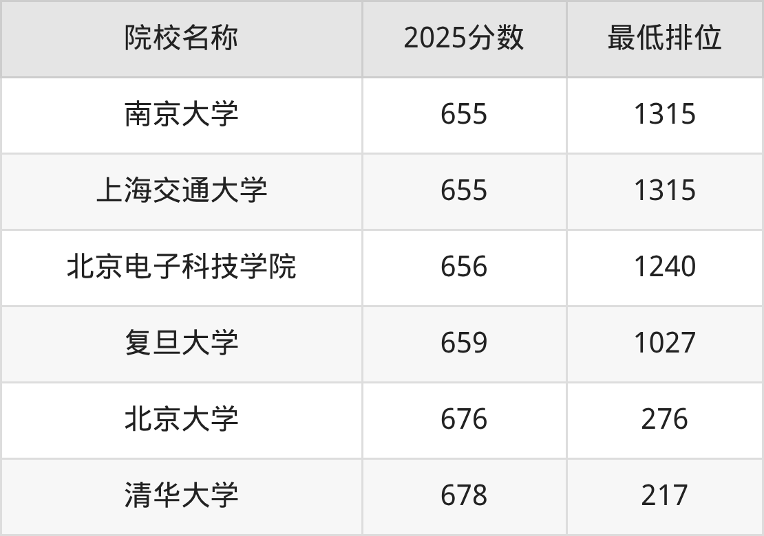 第一梯队(670分+):北京大学(676分)、清华大学(678分)
