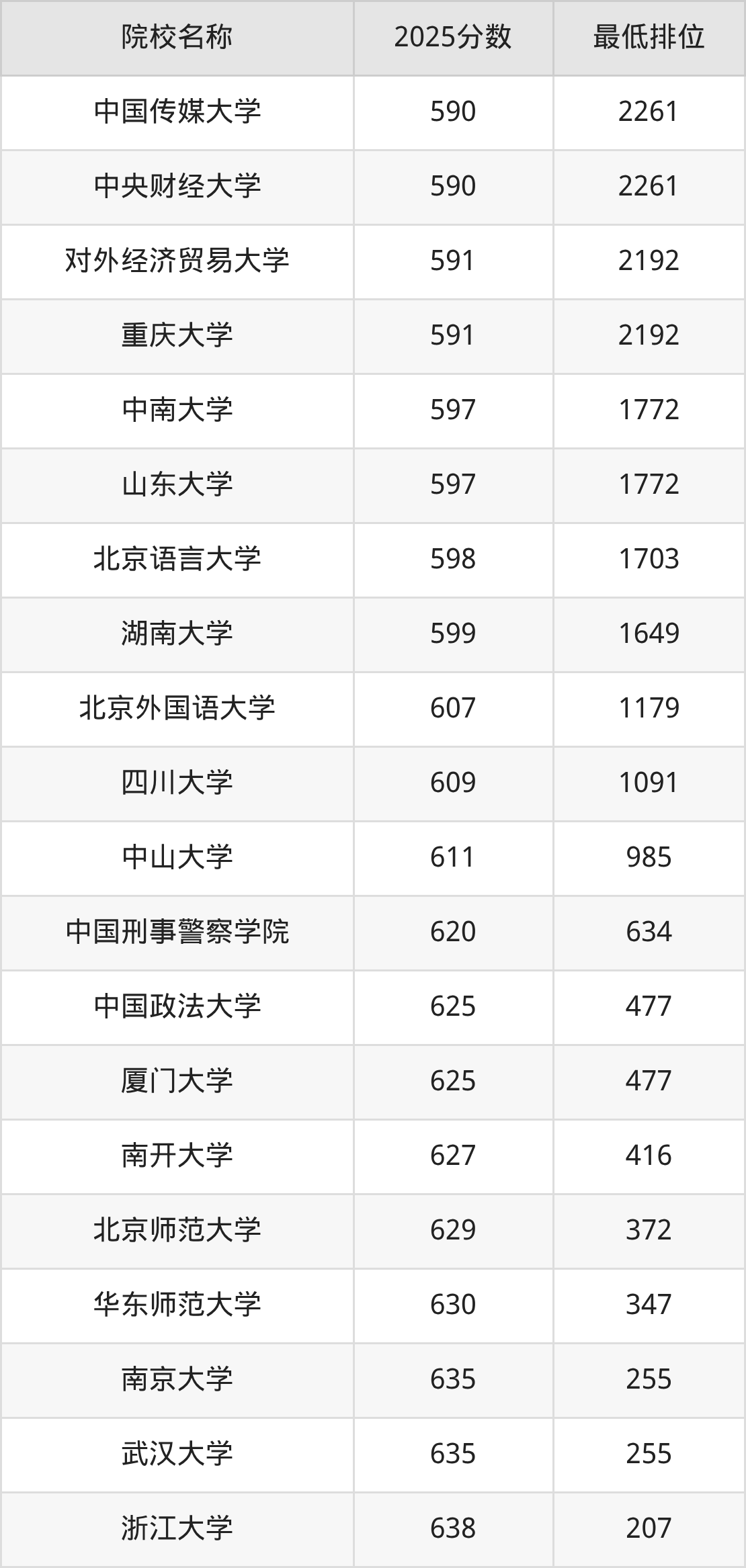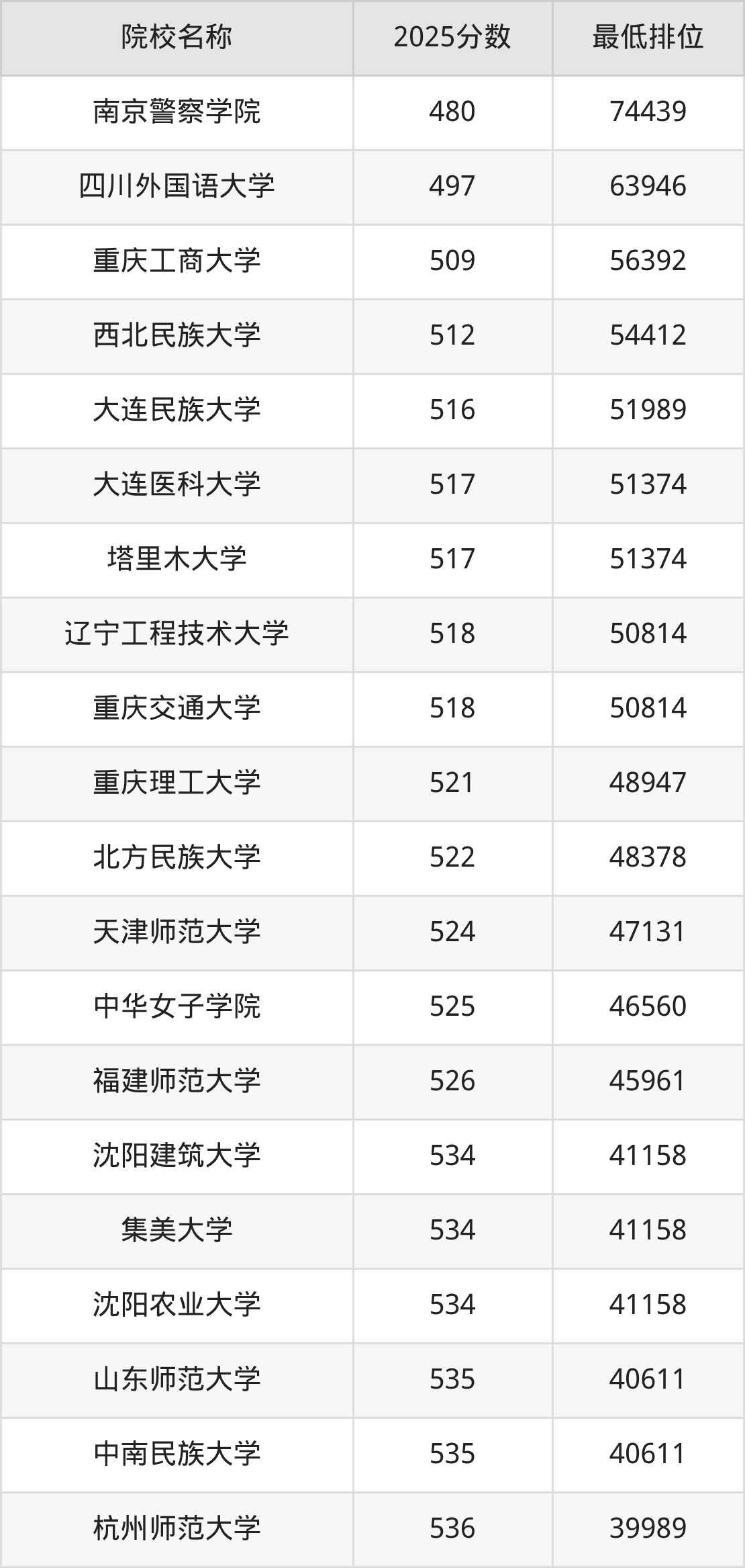 第二梯队(491-669分):四川外国语大学(497分)、重庆工商大学(509分)、西北民族大学(512分)、大连民族大学(516分)