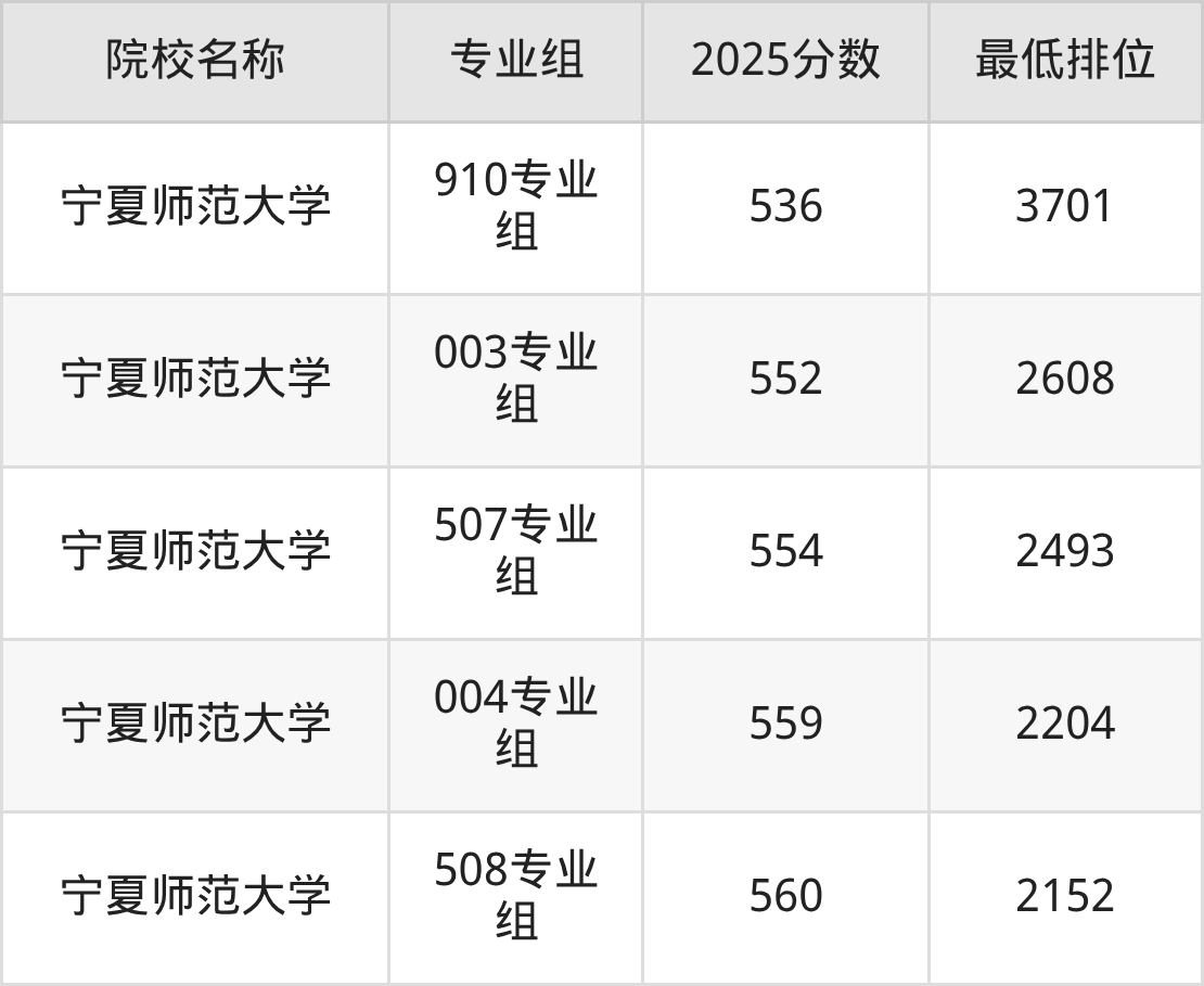 第二梯队(541-559分):宁夏师范大学(003专业组是552分)、宁夏师范大学(507专业组是554分)、宁夏师范大学(004专业组是559分)