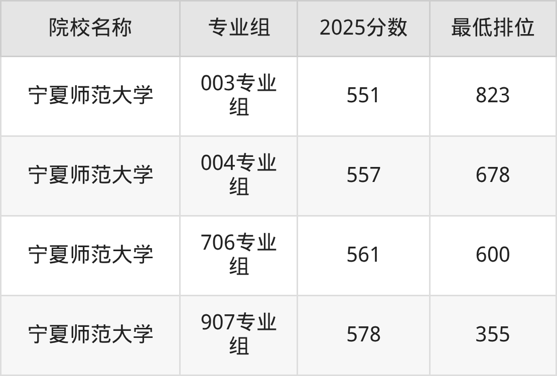 第三梯队(560分及以下):宁夏师范大学(003专业组是551分)、宁夏师范大学(004专业组是557分)