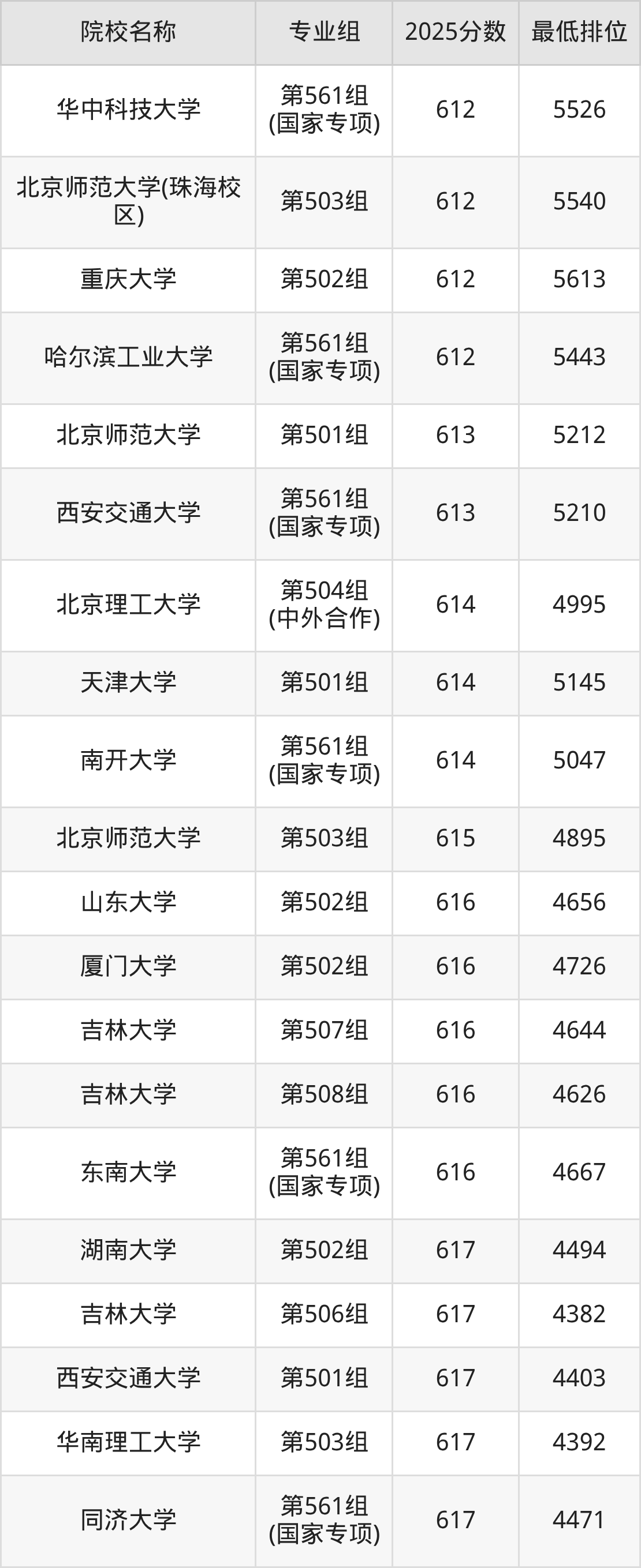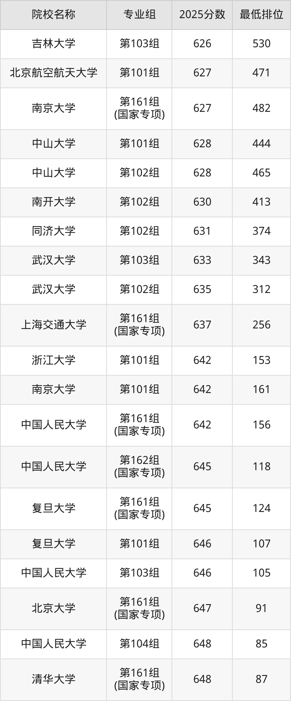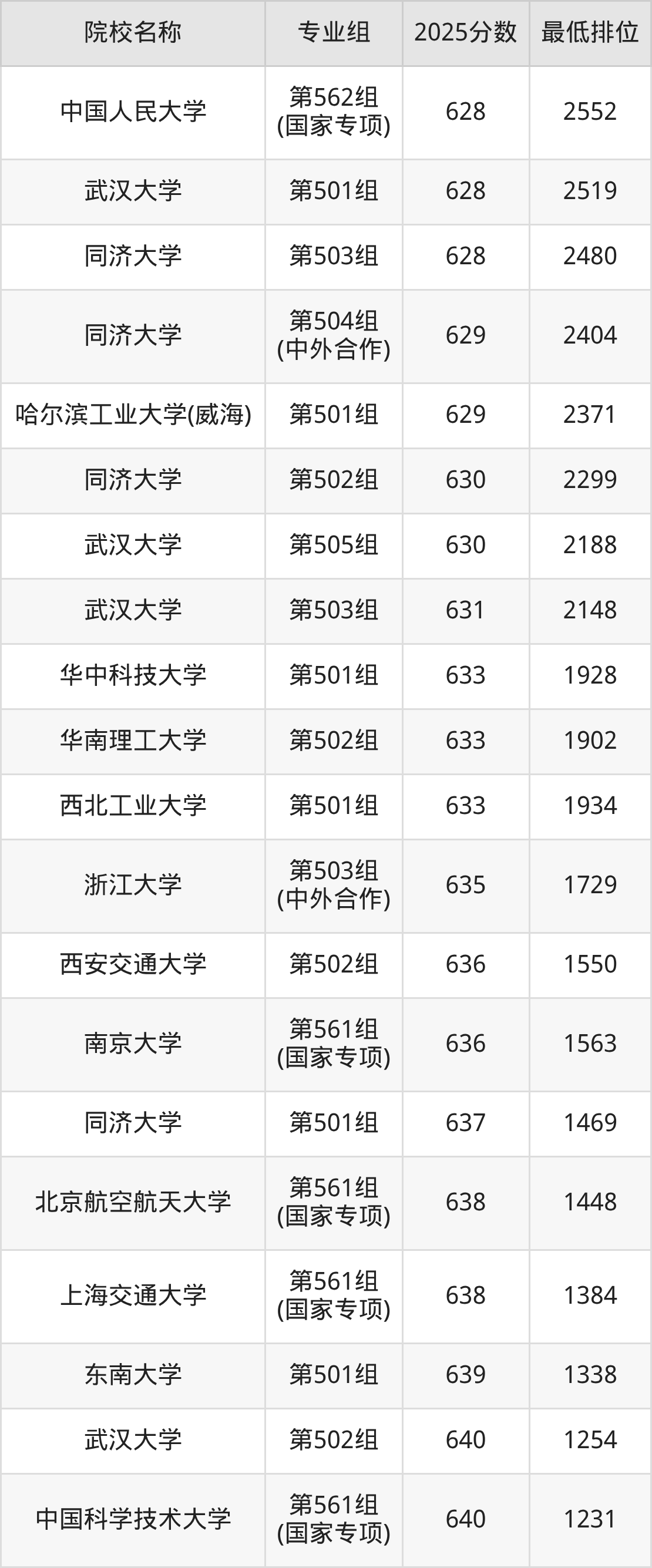 第三梯队(540分及以下):中央民族大学(第161组(国家专项)是537分)
