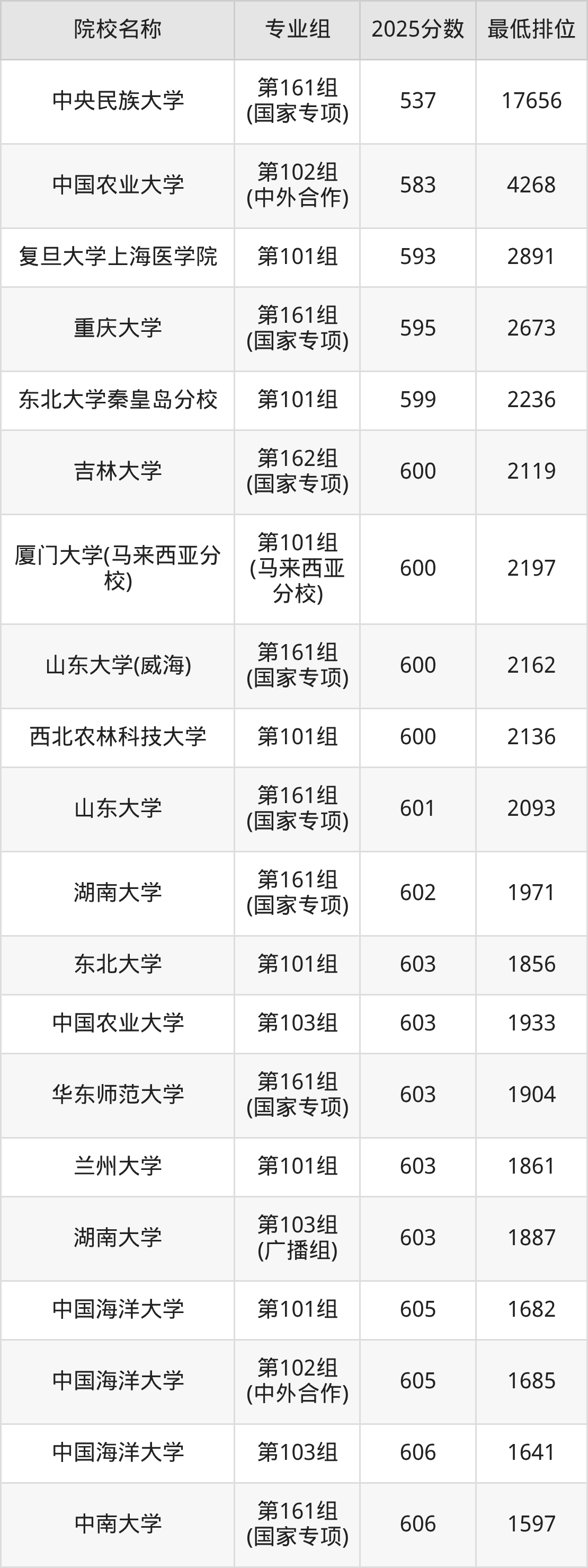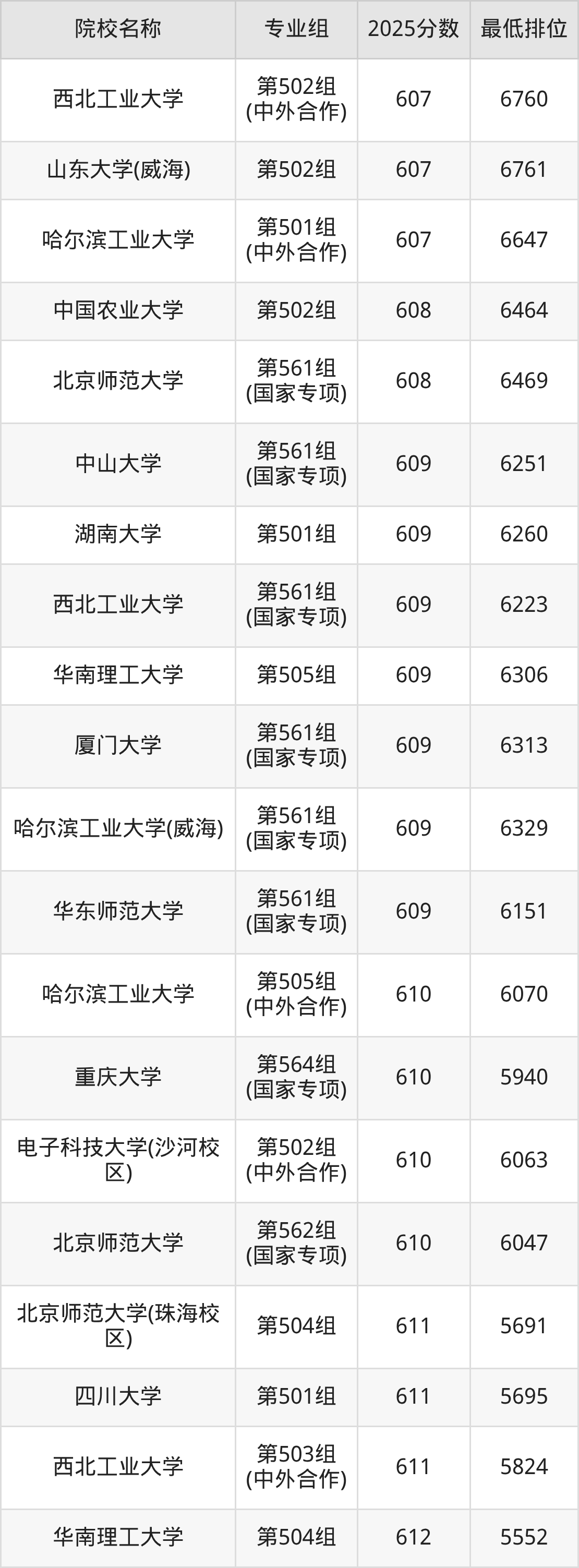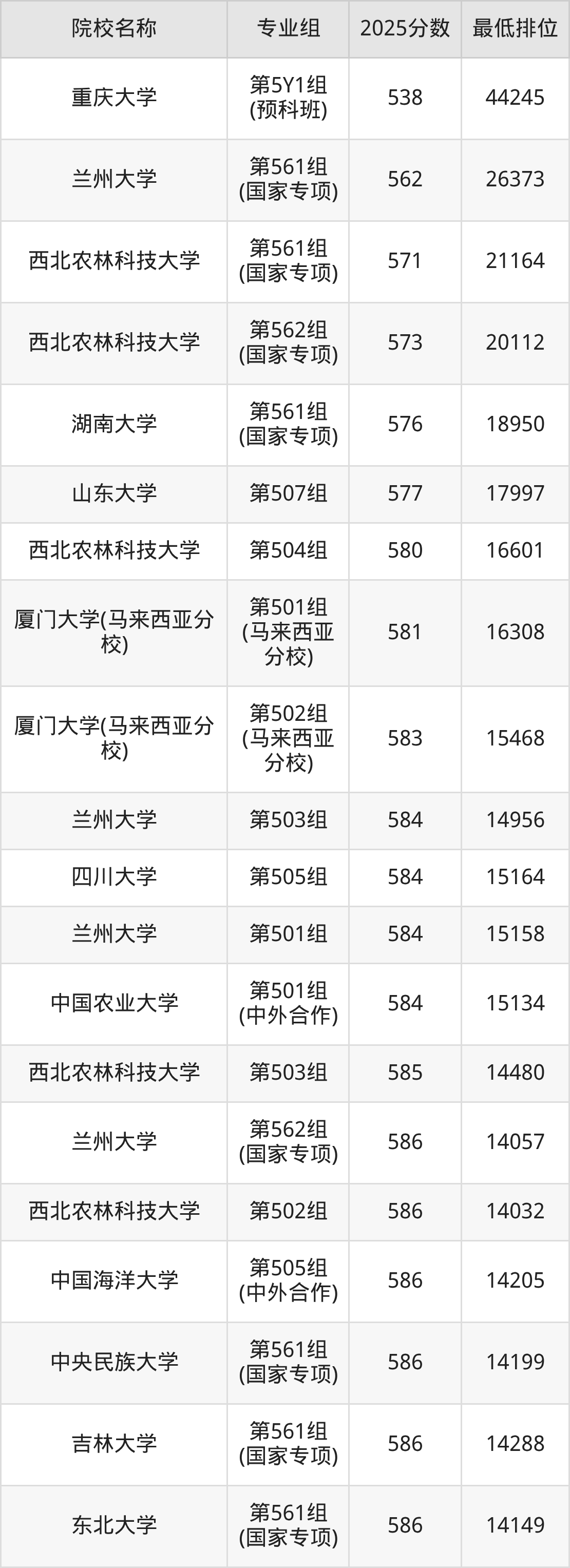 第二梯队(541-669分):兰州大学(第561组(国家专项)是562分)、西北农林科技大学(第561组(国家专项)是571分)、西北农林科技大学(第562组(国家专项)是573分)、湖南大学(第561组(国家专项)是576分)