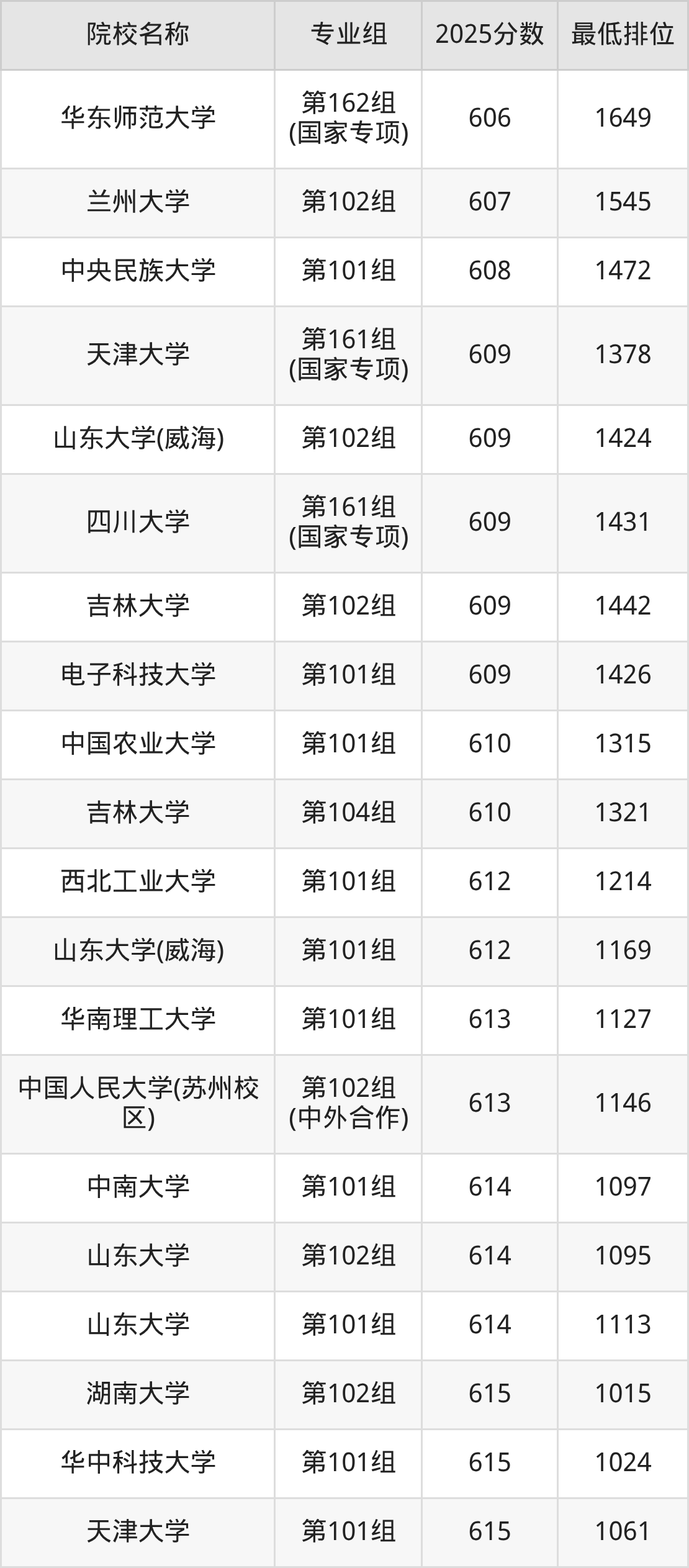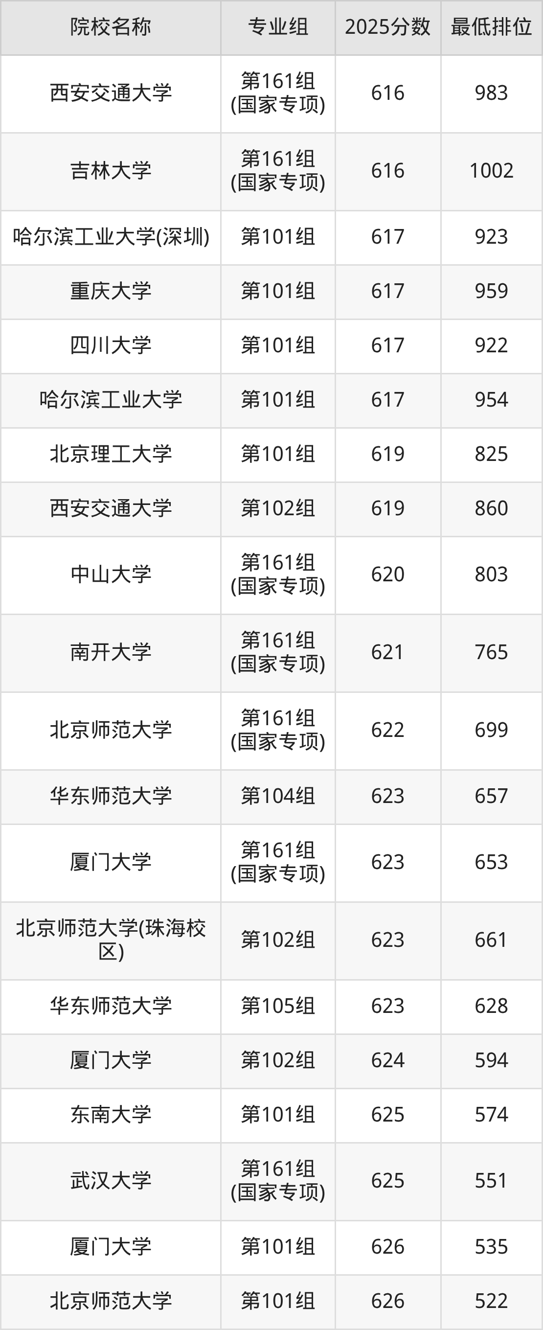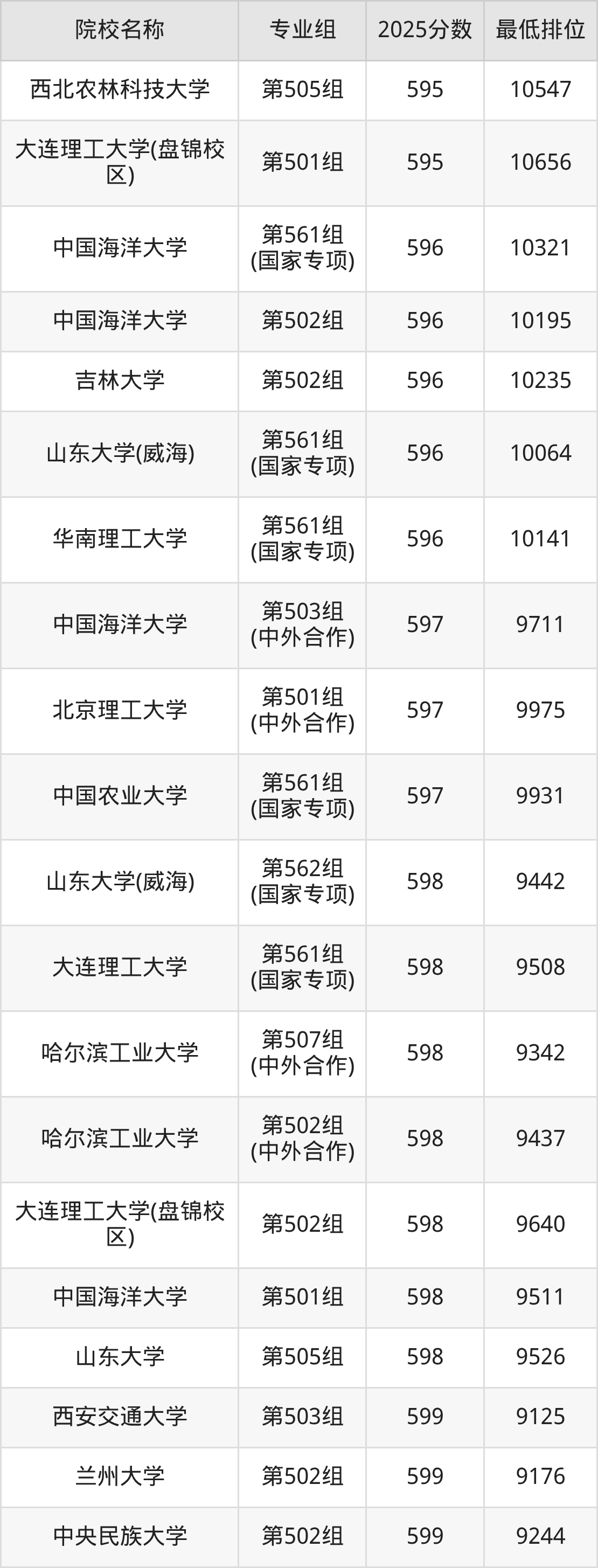 第二梯队(541-669分):兰州大学(第561组(国家专项)是562分)、西北农林科技大学(第561组(国家专项)是571分)、西北农林科技大学(第562组(国家专项)是573分)、湖南大学(第561组(国家专项)是576分)