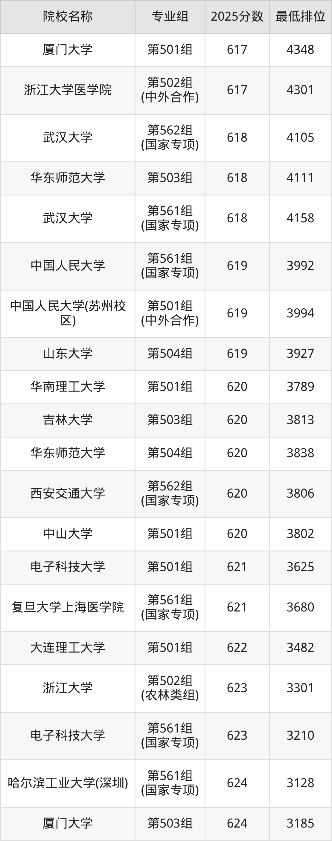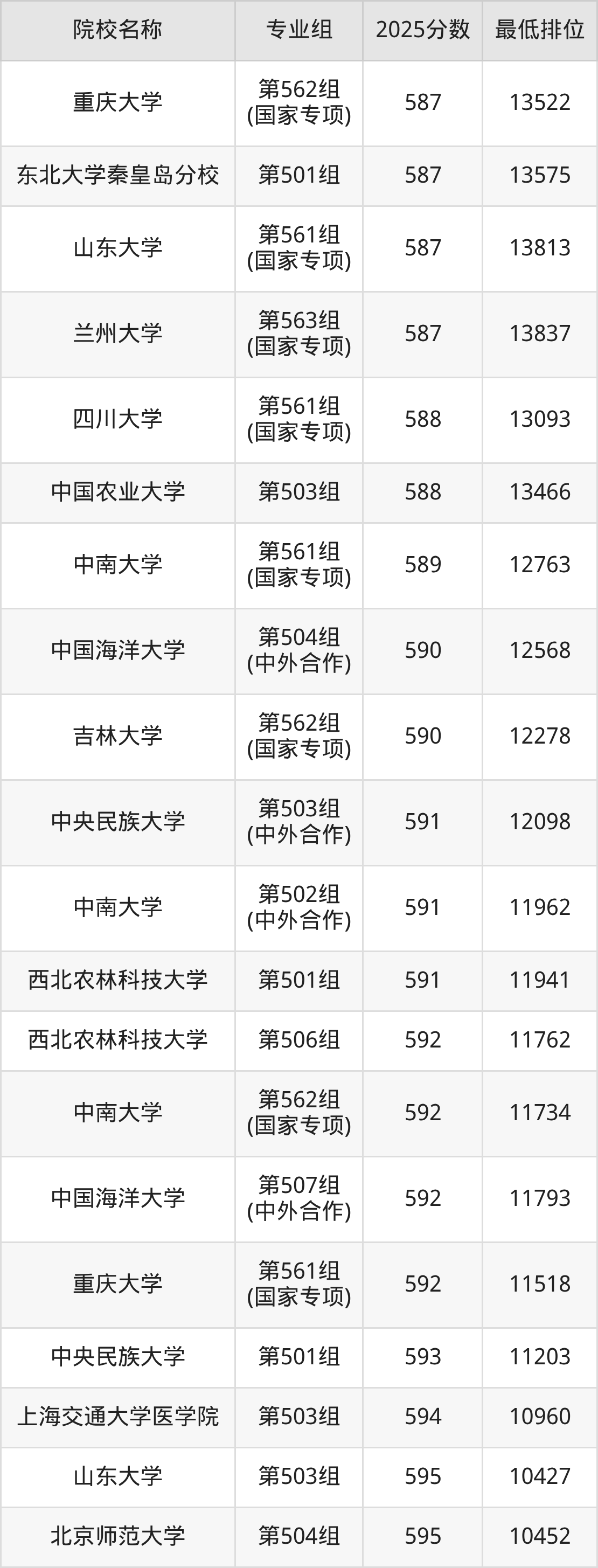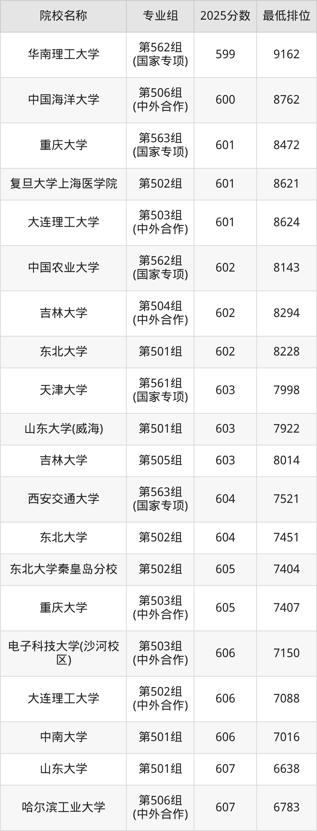 第二梯队(541-659分):中国农业大学(第102组(中外合作)是583分)、复旦大学上海医学院(第101组是593分)、重庆大学(第161组(国家专项)是595分)、东北大学秦皇岛分校(第101组是599分)