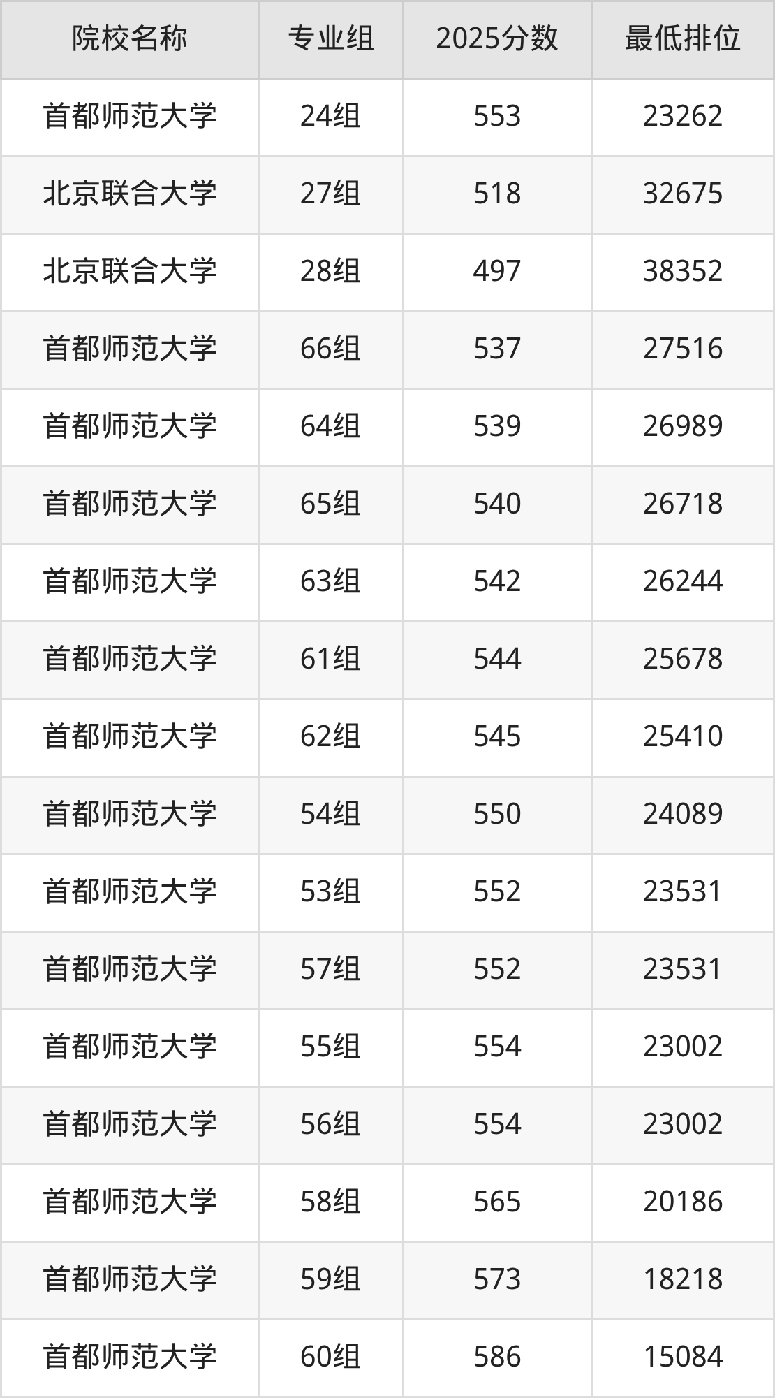 第二梯队(501-579分):首都师范大学(24组是553分)、北京联合大学(27组是518分)、首都师范大学(66组是537分)、首都师范大学(64组是539分)