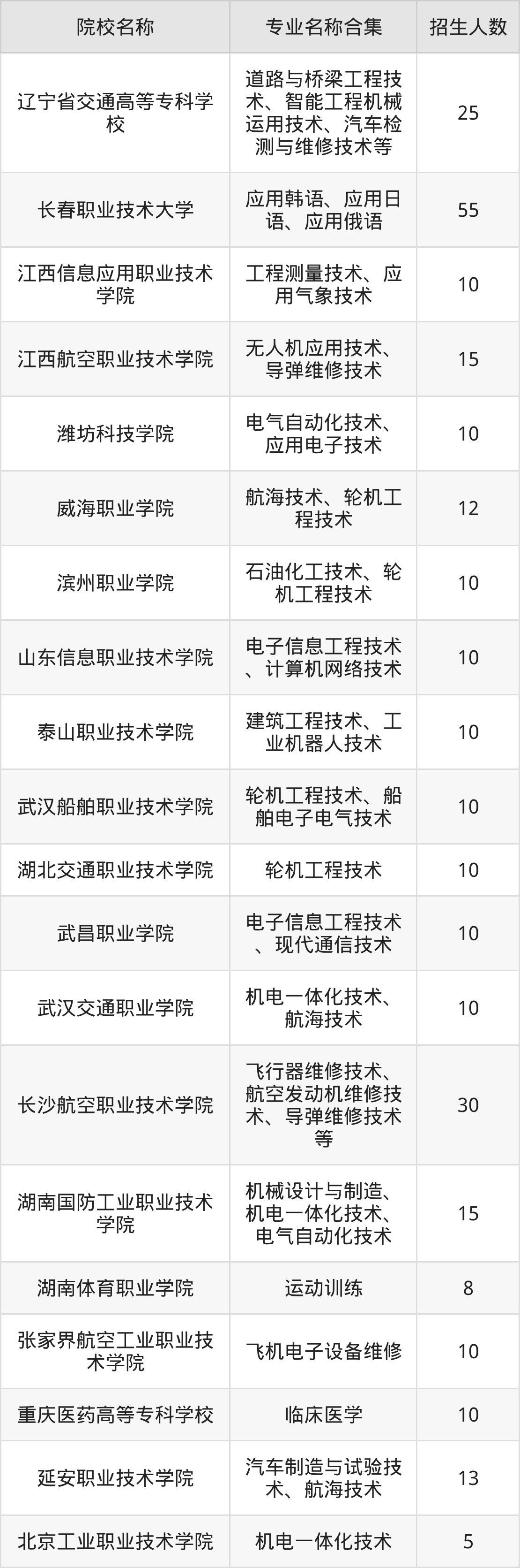 湖南:长沙航空职业技术学院、湖南国防工业职业技术学院、湖南体育职业学院、张家界航空工业职业技术学院
