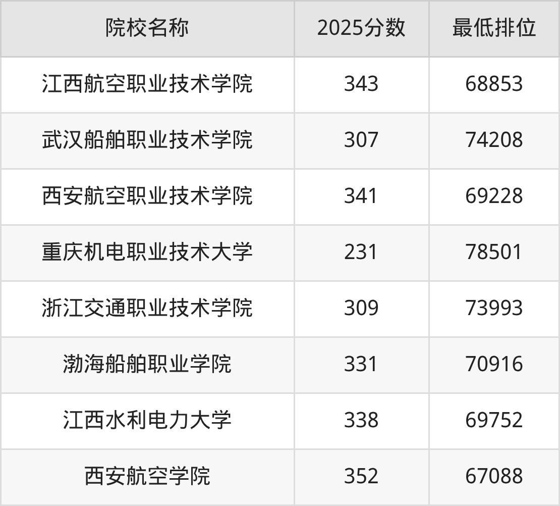 第二梯队(241-349分):江西航空职业技术学院(343分)、武汉船舶职业技术学院(307分)、西安航空职业技术学院(341分)、浙江交通职业技术学院(309分)