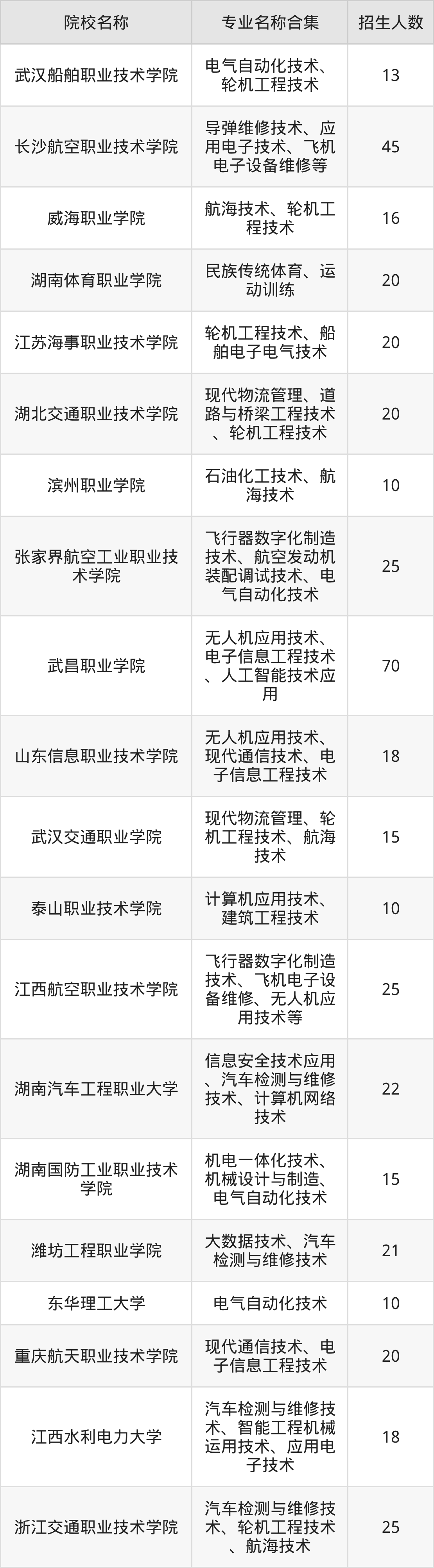 湖南:长沙航空职业技术学院、湖南体育职业学院、张家界航空工业职业技术学院、湖南汽车工程职业大学、湖南国防工业职业技术学院
