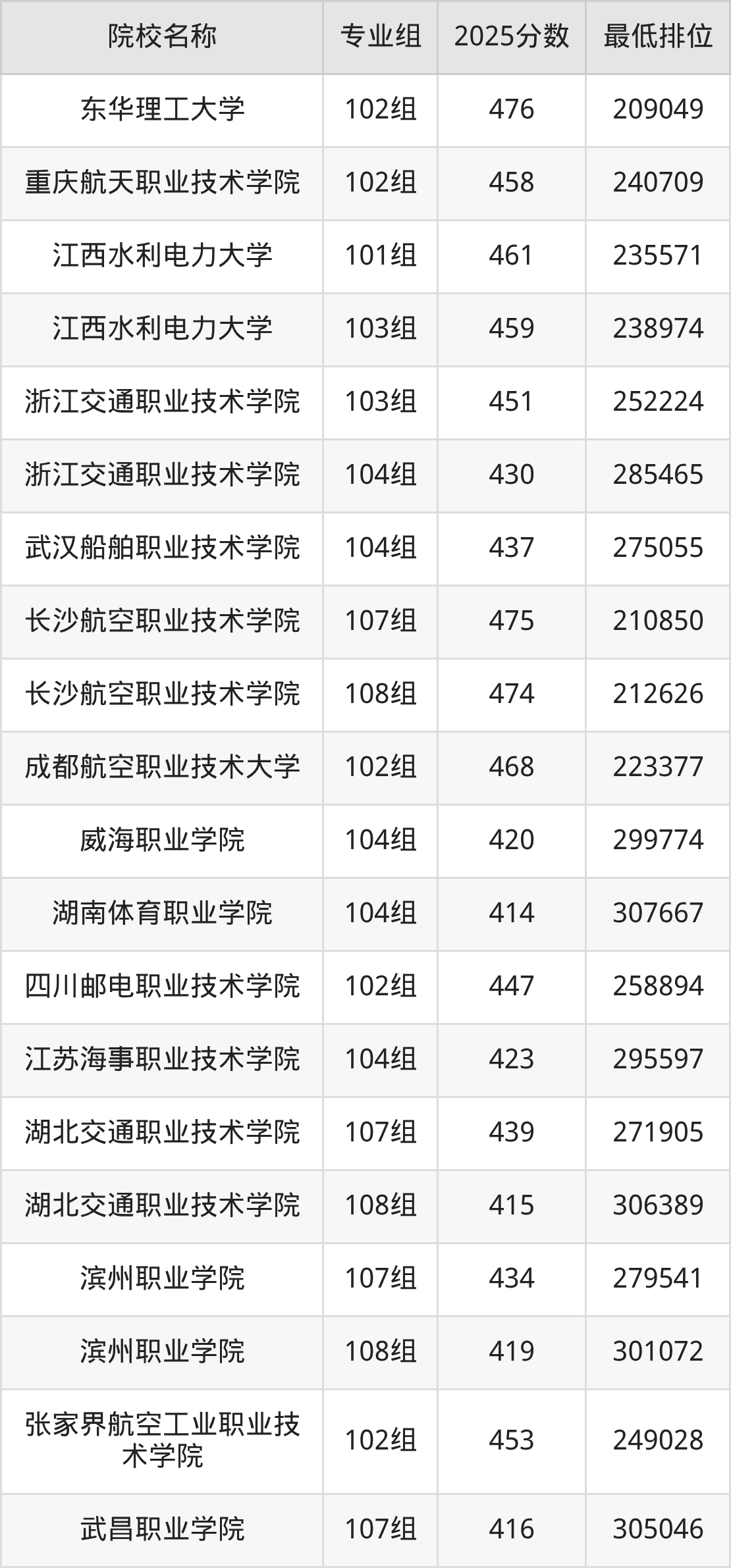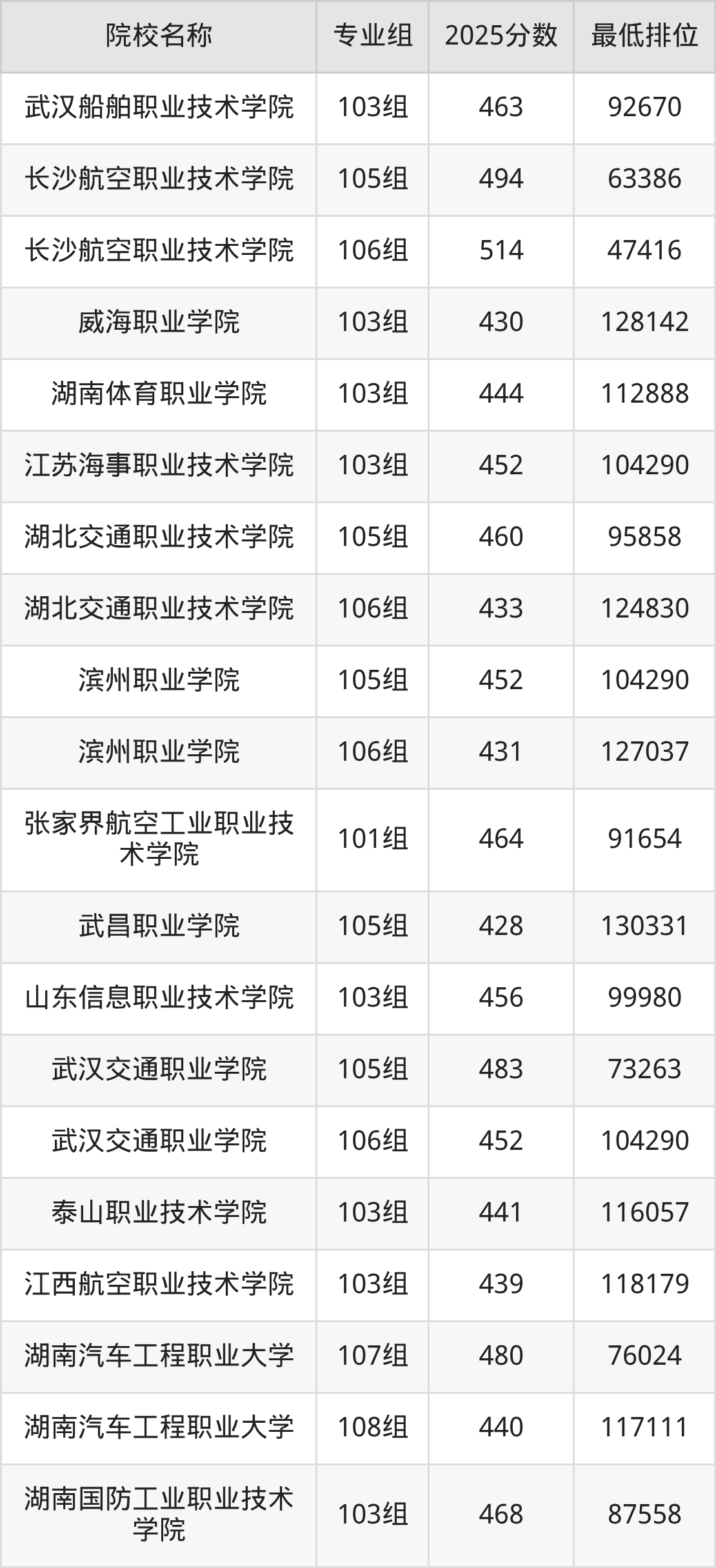 第二梯队(431-509分):武汉船舶职业技术学院(103组是463分)、长沙航空职业技术学院(105组是494分)、湖南体育职业学院(103组是444分)、江苏海事职业技术学院(103组是452分)