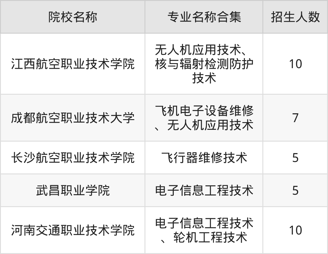 其中,江西航空职业技术学院、河南交通职业技术学院分别以10人招生规模居首,成都航空职业技术大学7人紧随其后,长沙航空职业技术学院、武昌职业学院各招5人,构成招生第一梯队。