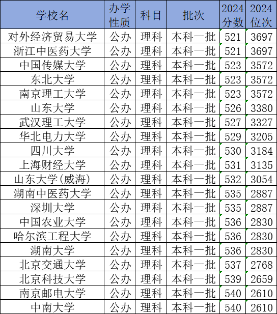 下面是理科生520-540分能上的大学名单一览表: