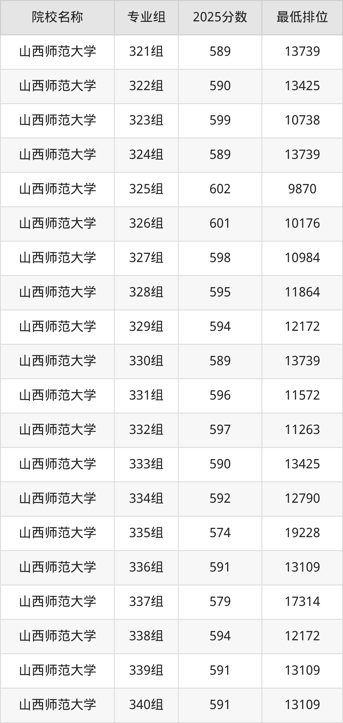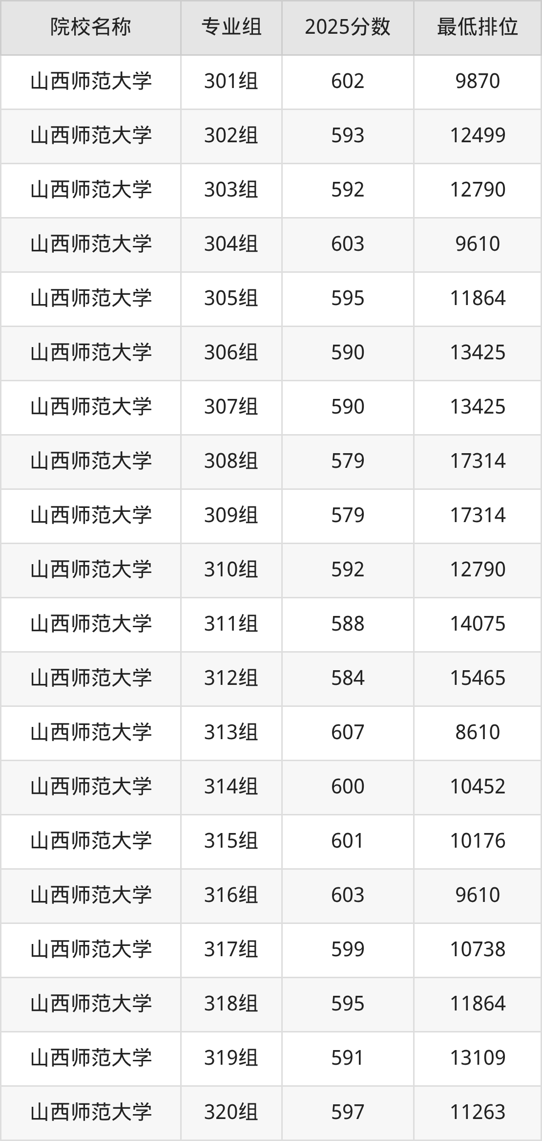 第一梯队(600分+):山西师范大学(301组是602分)、山西师范大学(304组是603分)、山西师范大学(313组是607分)、山西师范大学(314组是600分)