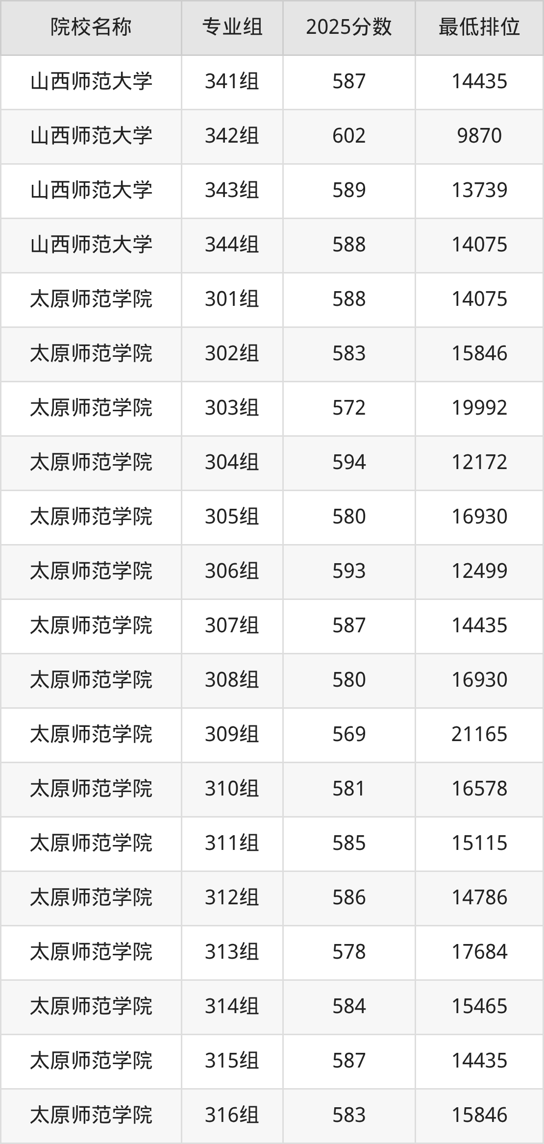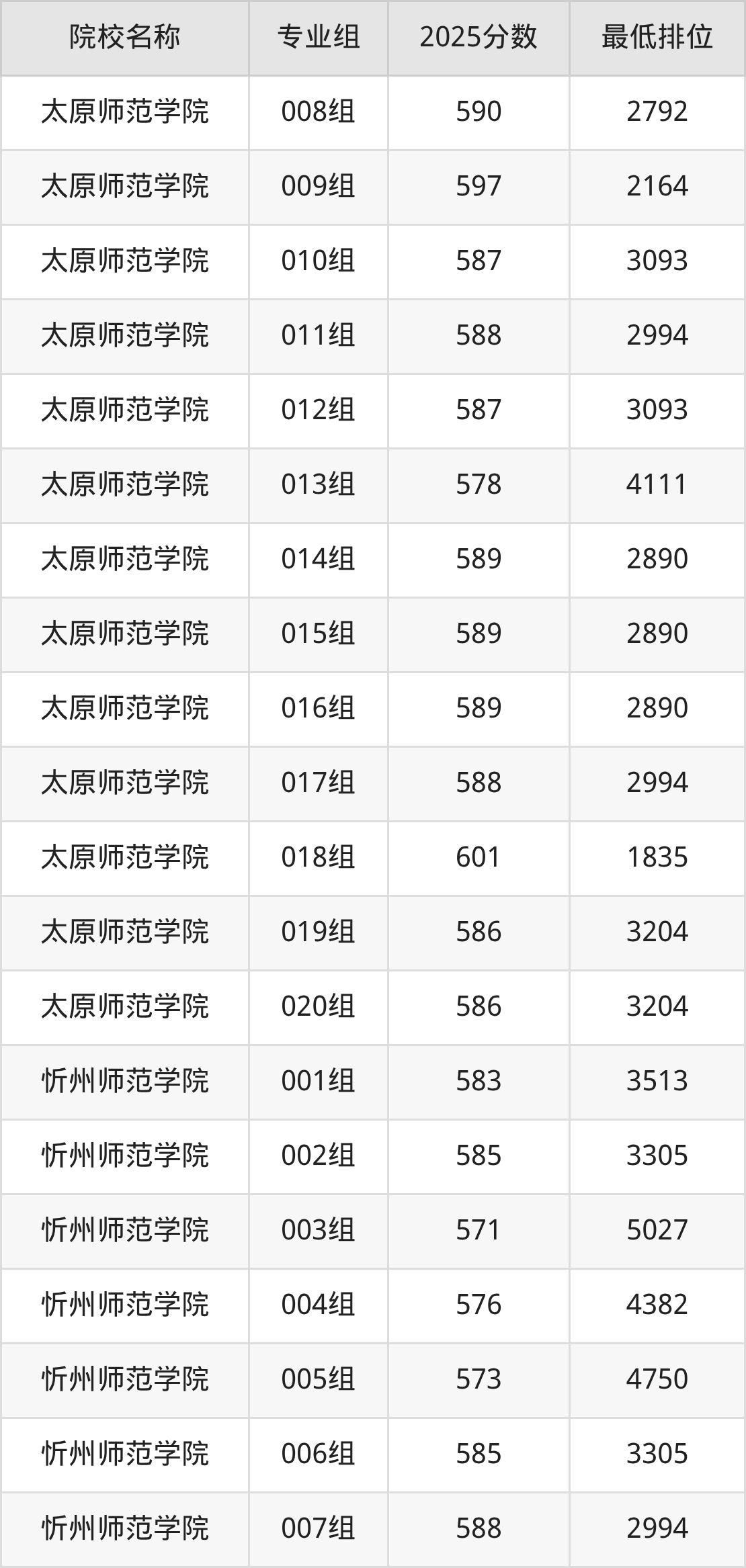 第三梯队(580分及以下):太原师范学院(002组是579分)、太原师范学院(003组是579分)、太原师范学院(006组是578分)、太原师范学院(013组是578分)