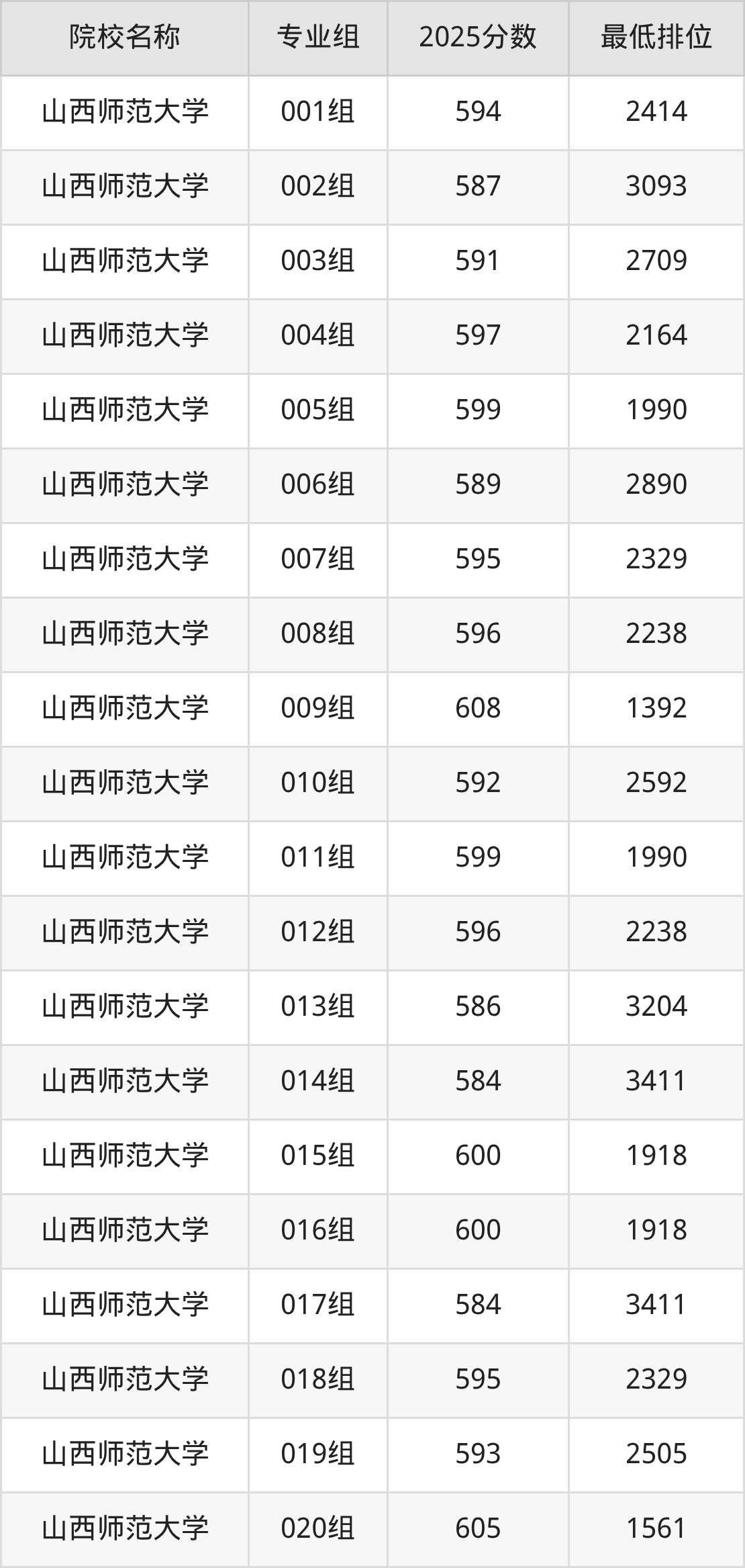 第一梯队(600分+):山西师范大学(009组是608分)、山西师范大学(015组是600分)、山西师范大学(016组是600分)、山西师范大学(020组是605分)
