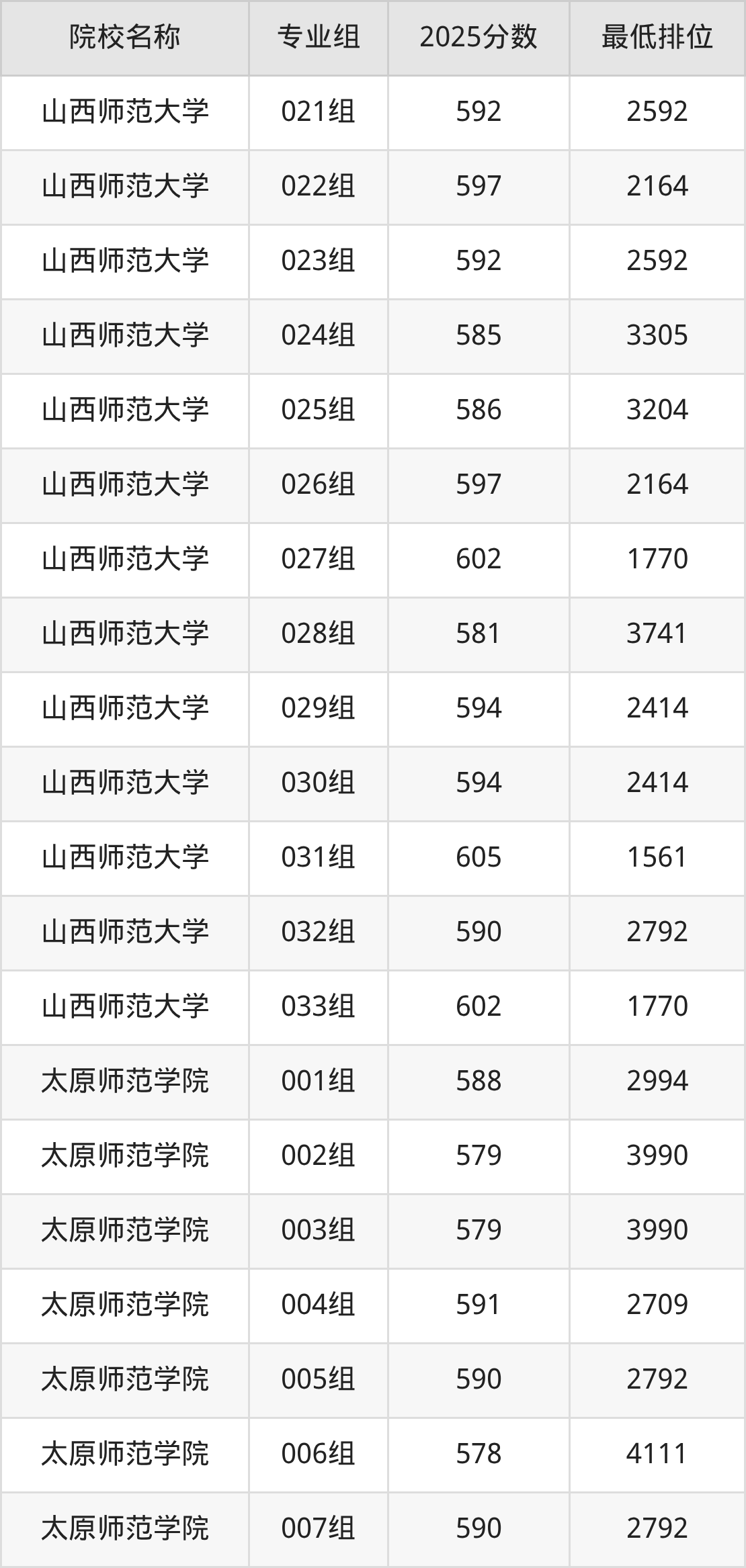 第二梯队(581-599分):山西师范大学(001组是594分)、山西师范大学(002组是587分)、山西师范大学(003组是591分)、山西师范大学(004组是597分)