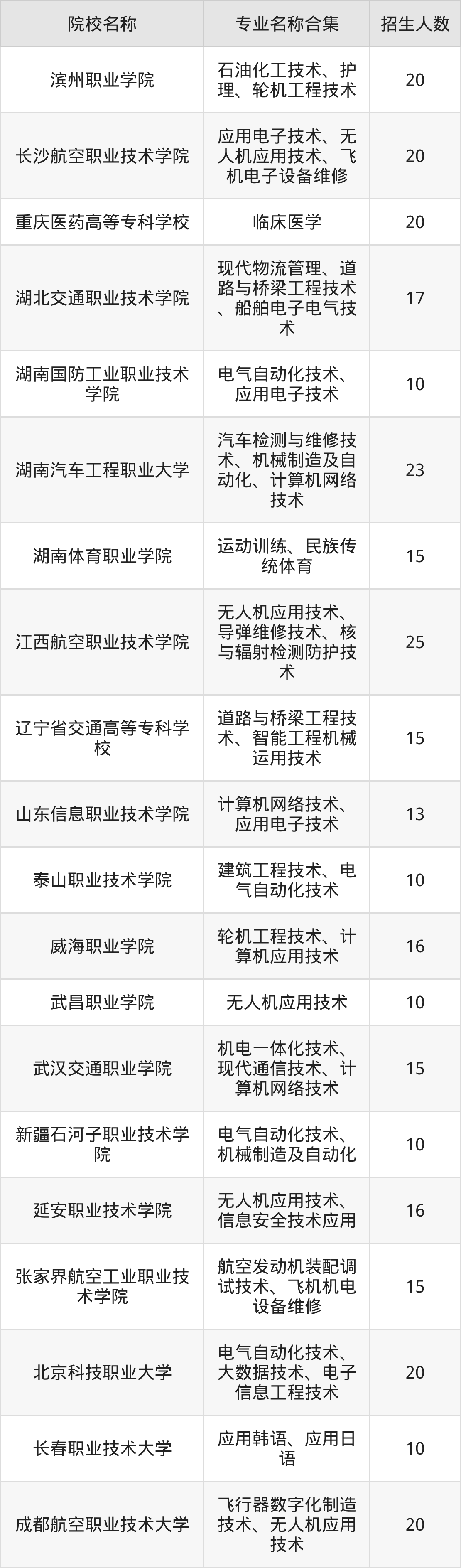 湖南:长沙航空职业技术学院、湖南国防工业职业技术学院、湖南汽车工程职业大学、湖南体育职业学院、张家界航空工业职业技术学院