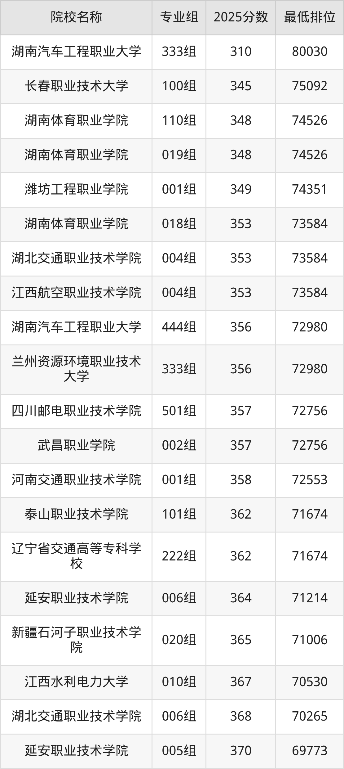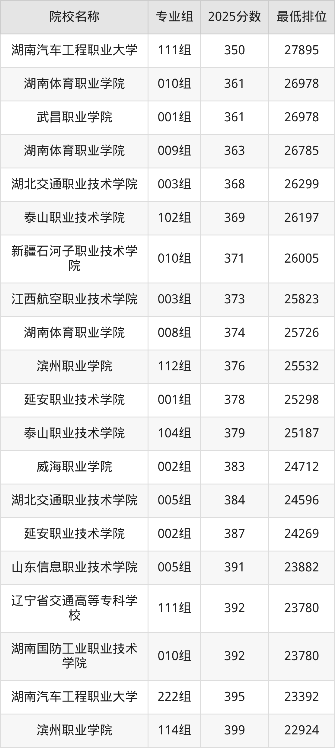 第三梯队(360分及以下):湖南汽车工程职业大学(111组是350分)