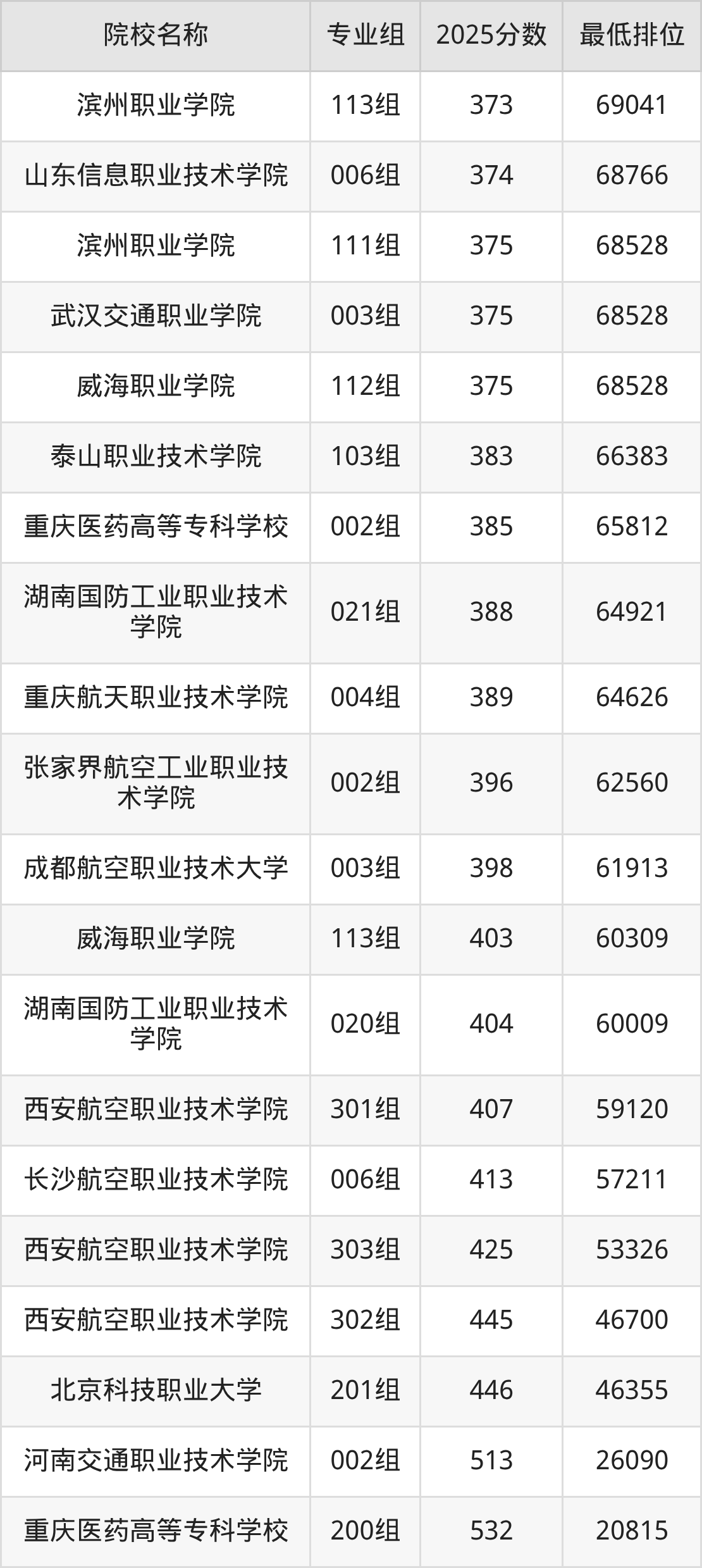 第二梯队(321-529分):长春职业技术大学(100组是345分)、湖南体育职业学院(110组是348分)、湖南体育职业学院(019组是348分)、潍坊工程职业学院(001组是349分)