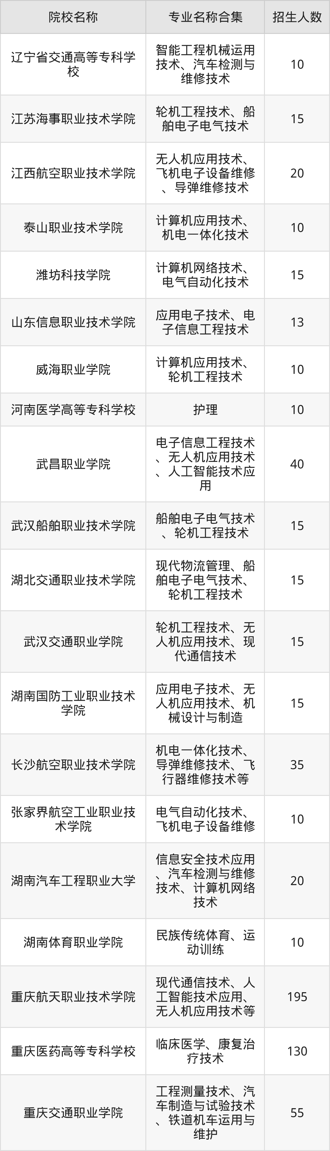 湖南:湖南国防工业职业技术学院、长沙航空职业技术学院、张家界航空工业职业技术学院、湖南汽车工程职业大学、湖南体育职业学院