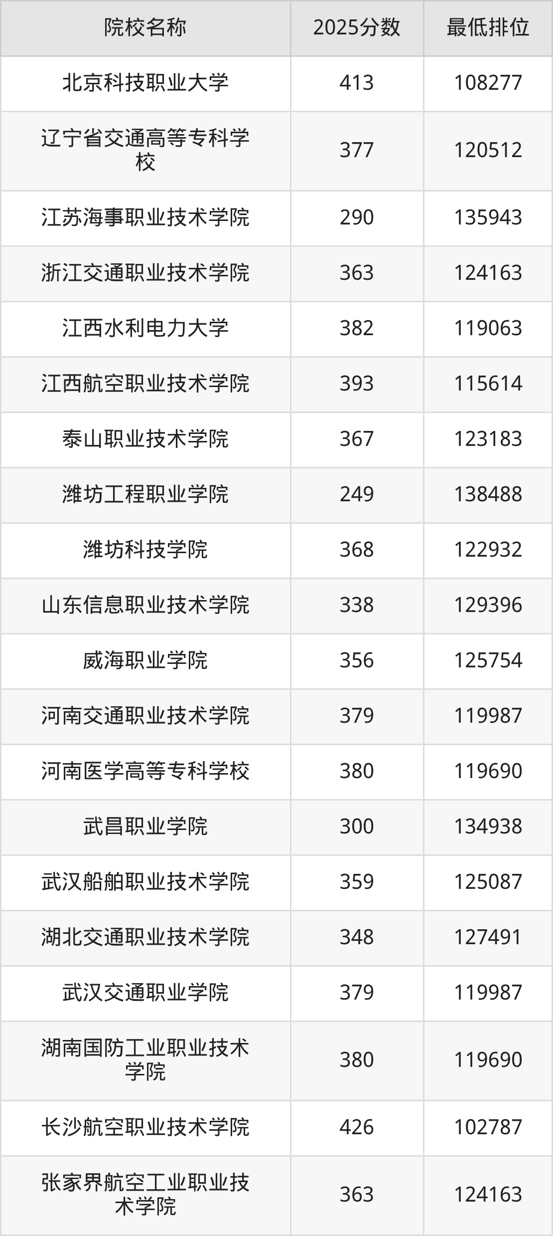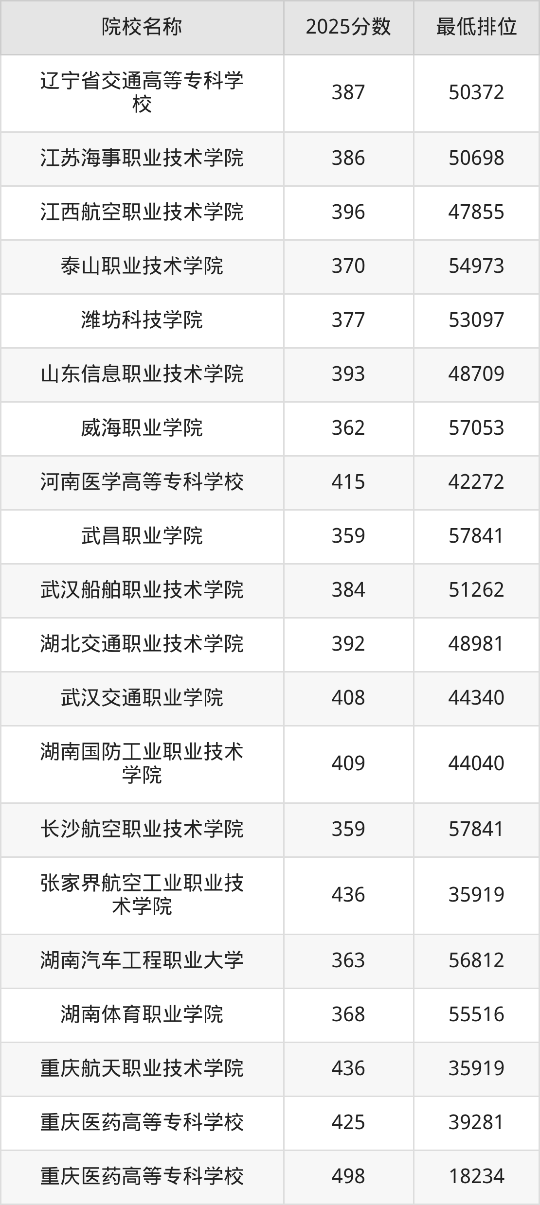 第二梯队(361-489分):辽宁省交通高等专科学校(387分)、江苏海事职业技术学院(386分)、江西航空职业技术学院(396分)、泰山职业技术学院(370分)