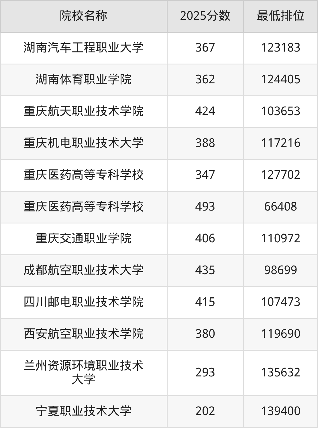 2025年在重庆高考共计31所定向士官院校招生,市外高校有27所、市内高校有4所,包含重庆航天职业技术学院、重庆医药高等专科学校、重庆交通职业学院等。再看重庆定向士官大学2025年录取分数线,物理类最低分区间是202至493分,历史类最低分区间是359至498分,2026届有意报考的同学请参考!