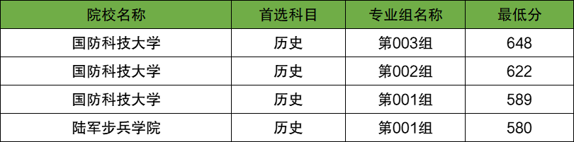 国防科技大学:历史类第001组最低589分、第002组最低622分、第003组最低648分;