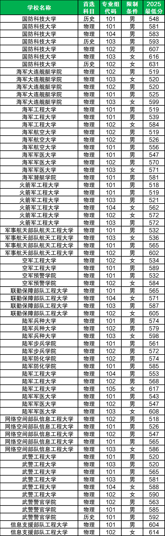 从性别角度来看,军校历史类女生最低需631分,比男生最低分(548分)高出83分,分数差异明显。