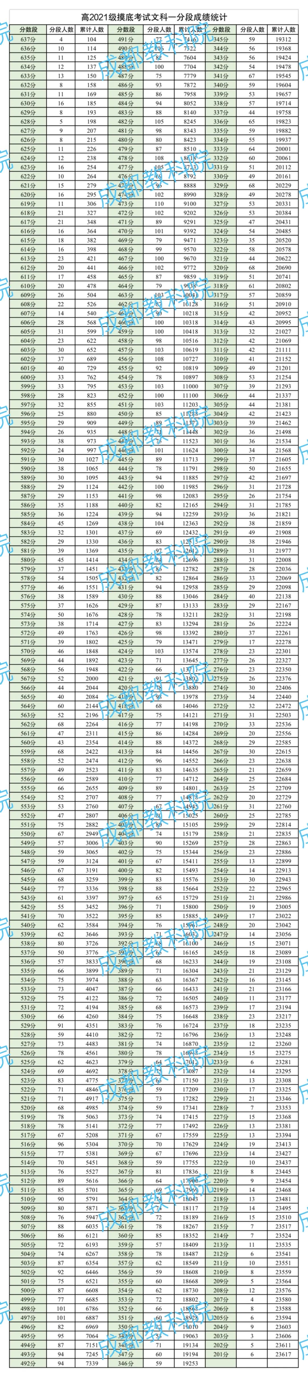 2021级摸底考文科一分一段表中,分数位于600分以上的累计人数762人;在500分以上的累计人数6608人;在450人以上的累计人数11288人。