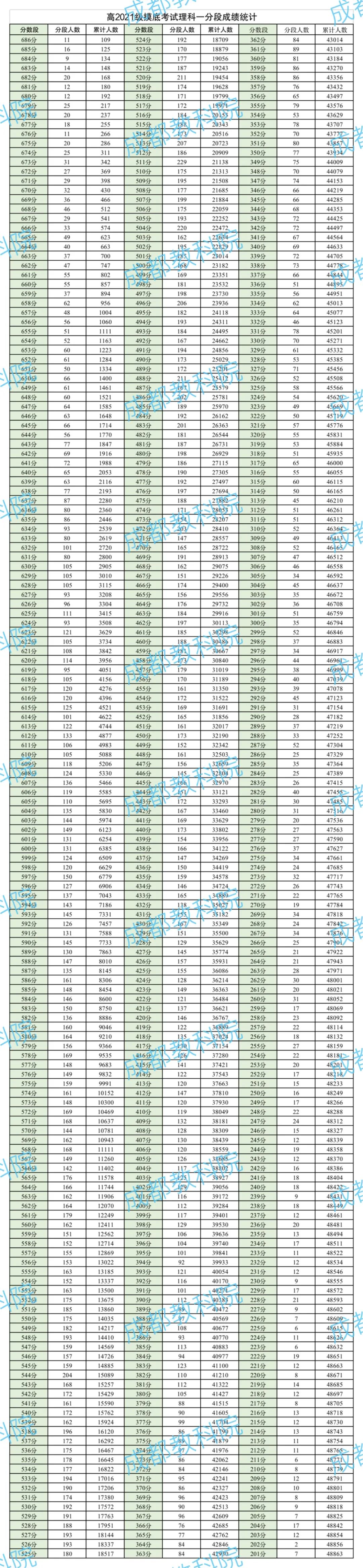 2021级摸底考理科一分一段表中,分数位于650分以上的累计人数1400人;在500分以上的累计人数23182人。