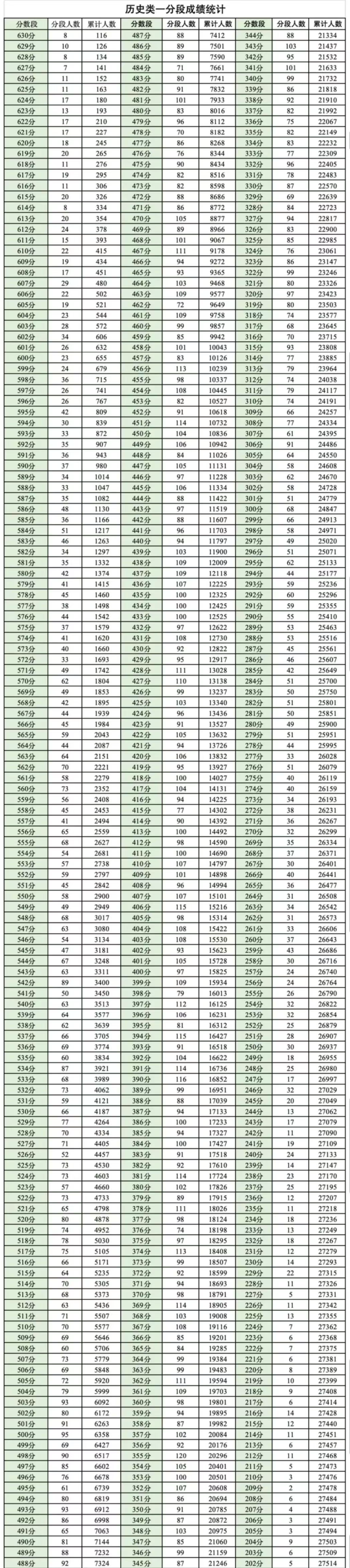 历史类:630分及以上累计人数116人、600分及以上累计人数655分、550分及以上累计人数2900人。