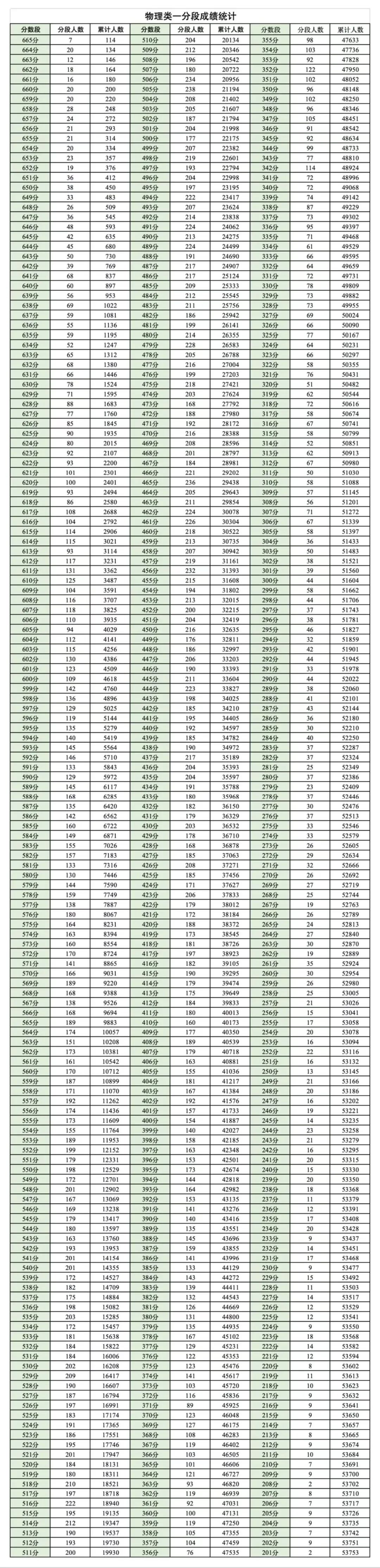 物理类:665分及以上累计人数114人、650分及以上累计人数450分、580分及以上累计人数7446人。