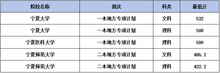宁夏地方专项计划大学名单及录取分数线: