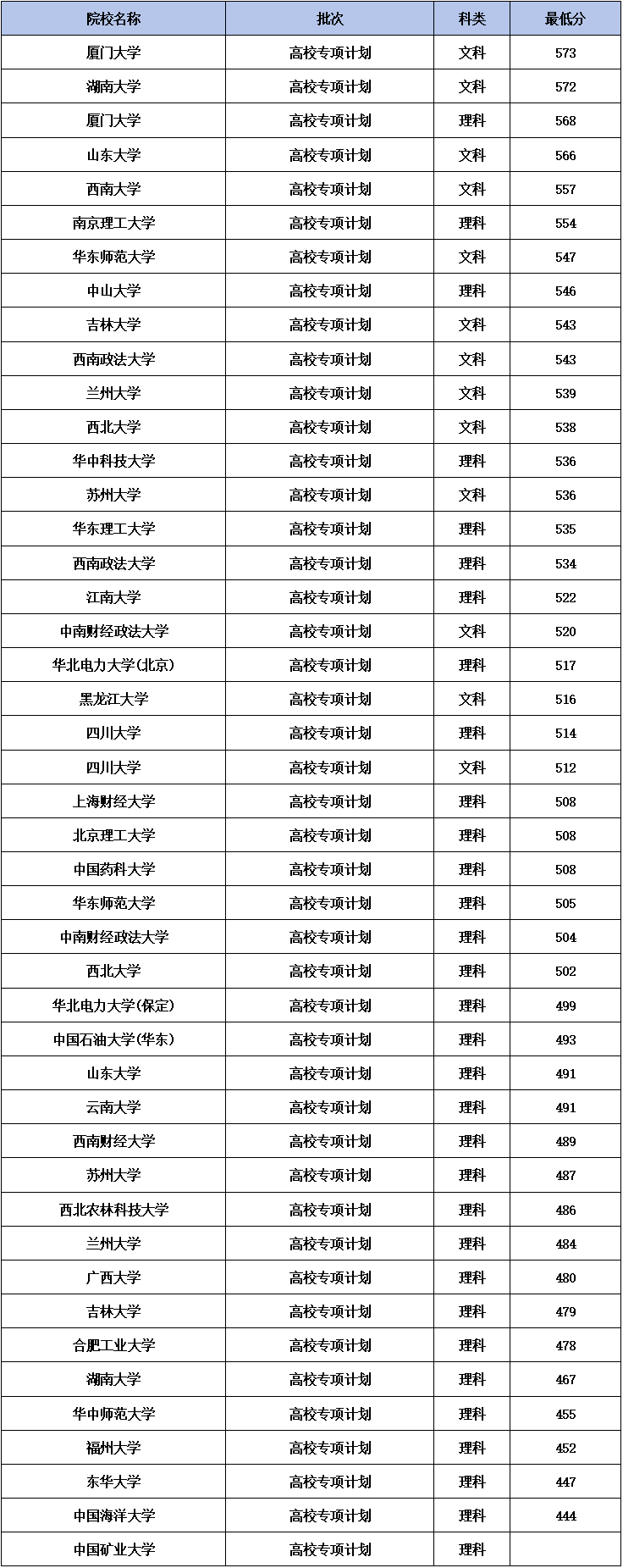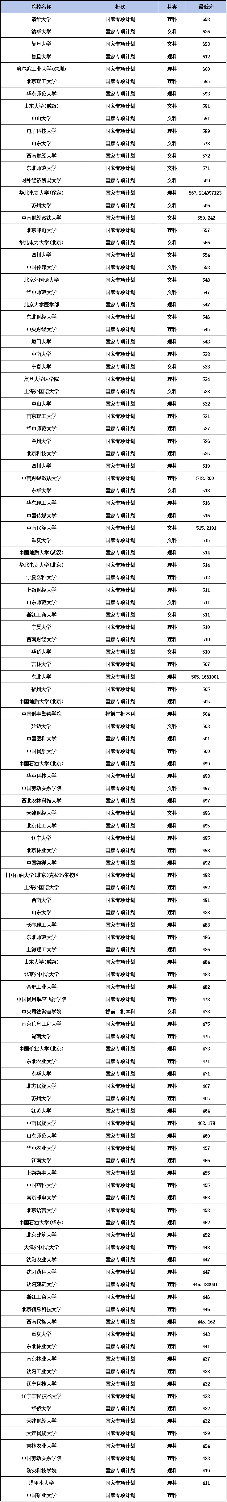 注:本文只整理出专项计划院校在宁夏的招生最低分,不含专业组、具体专业分数线。