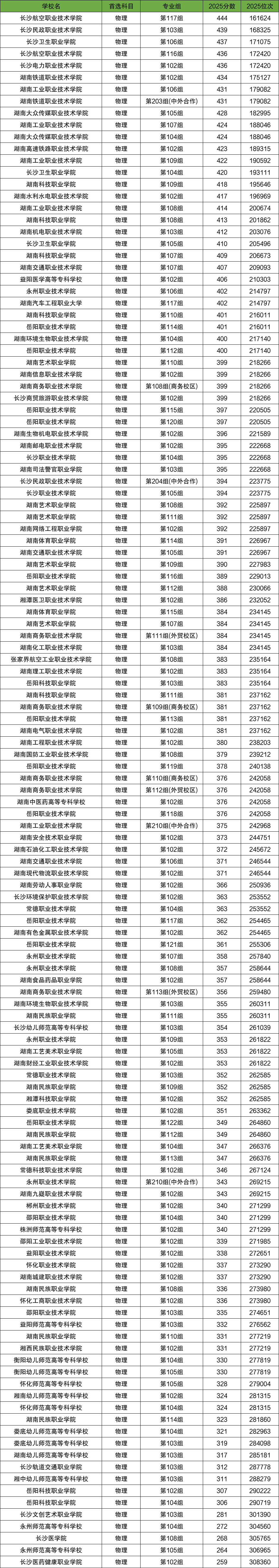 2025年湖南各专科大学录取分数线最低是259分、最高是444分。