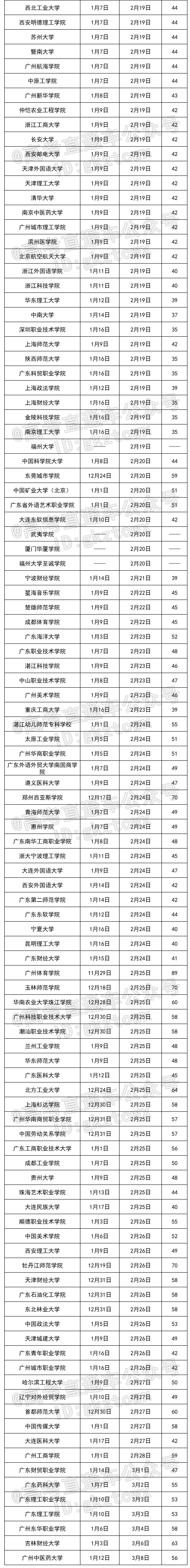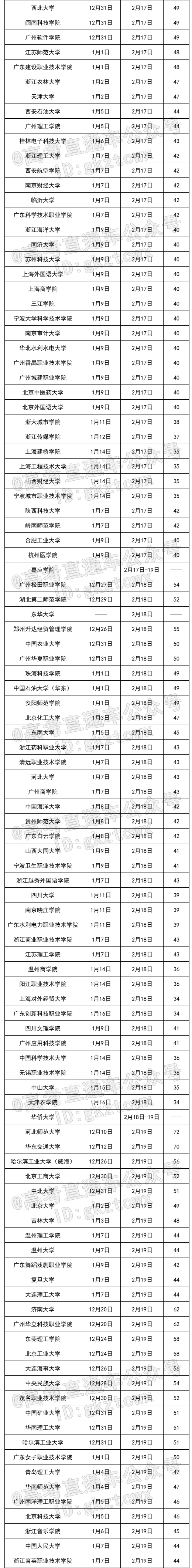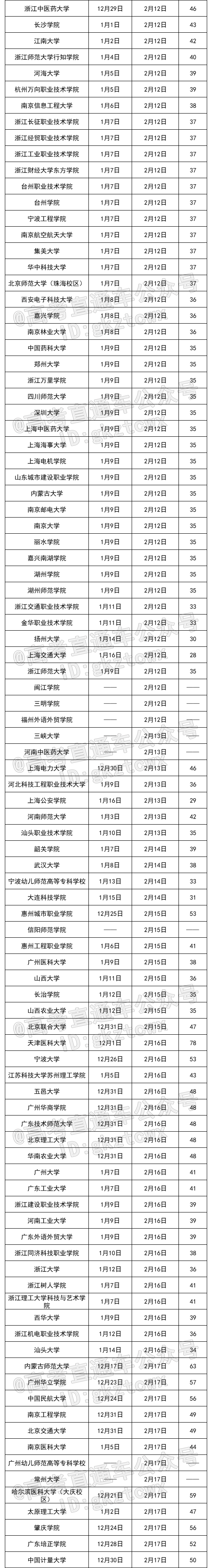 根据已公布的数据来看,大部分高校开学时间都集中在2月份,其中,开学时间最早的大学为广东生态工程职业学院,寒假仅有31天,1月30日就要正式上课;开学时间最晚的大学为广州中医药大学,寒假56天,3月8日才返校上课。
