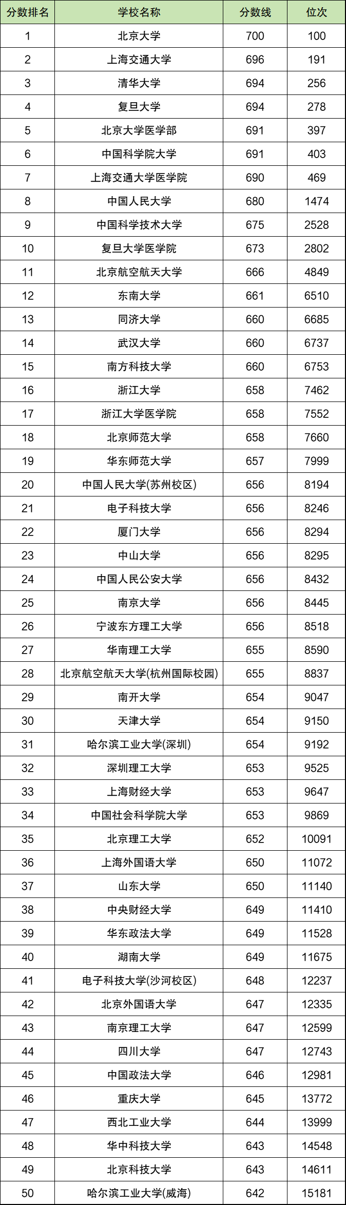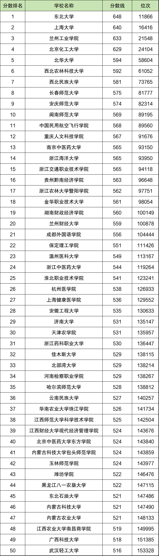 由于篇幅限制,以下仅为全国各大学在浙江一段最低录取分数线top50名单: