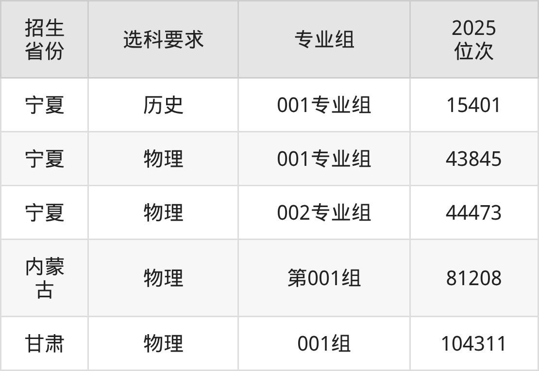 宁夏交通职业技术学院2025年在全国各省的位次差异较大,最高位次是15401位(宁夏历史类)、最低位次是104311位(甘肃物理类)。各省具体位次请看下图: