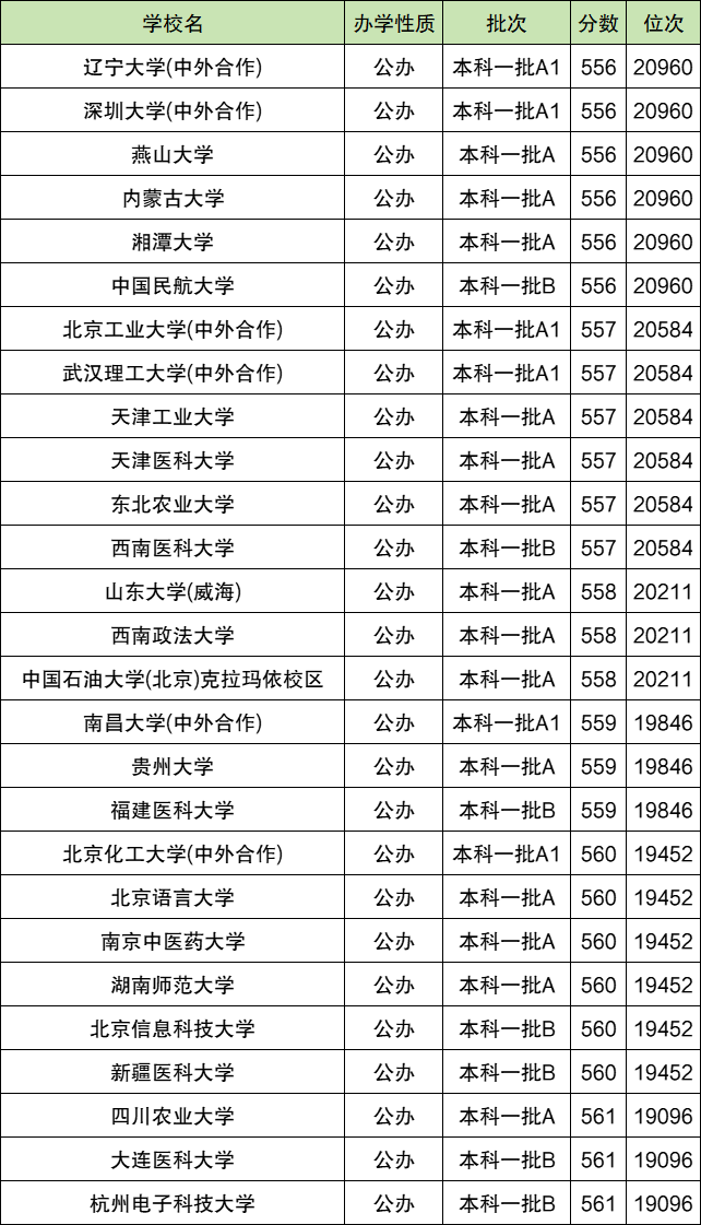 2万名左右最低位次对应的院校是辽宁大学(中外合作)、深圳大学(中外合作)、燕山大学,最低录取位次为20960位,位次对应分数为556分。