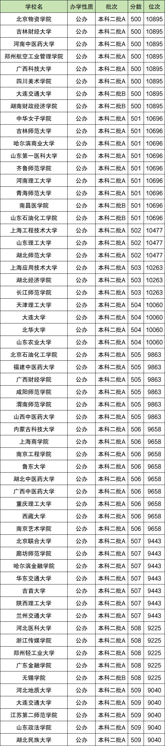 1万名左右最高位次对应的院校是江苏第二师范学院、山东政法学院、湖北民族大学,最低录取位次为9040位,位次对应分数为509分;
