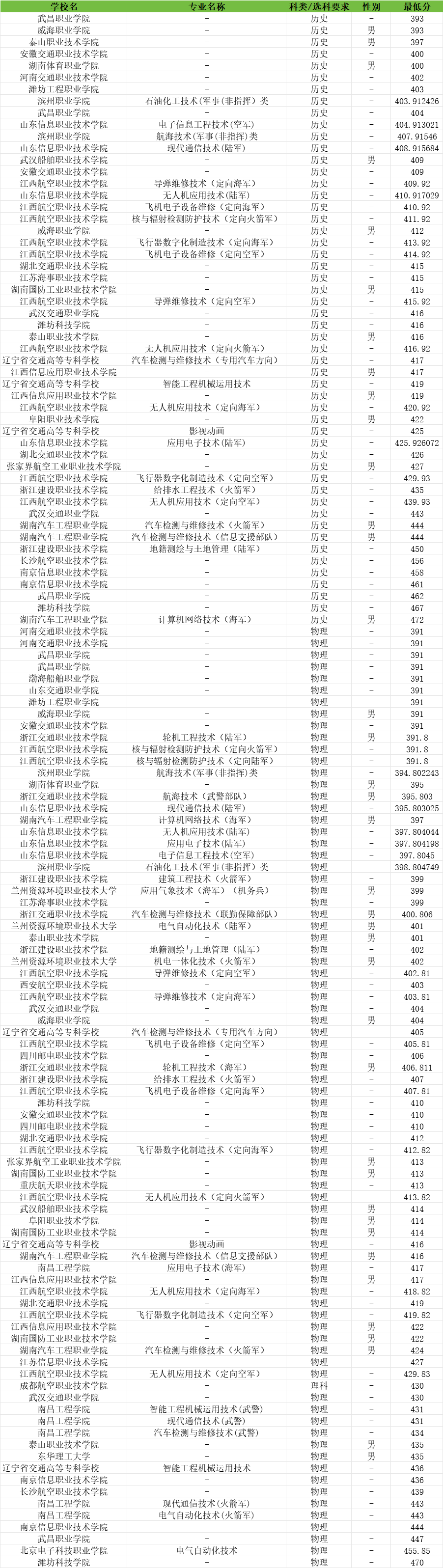 最低分393分对应的士官学校为武昌职业学院、威海职业学院,其中威海职业学院性别要求为男生。