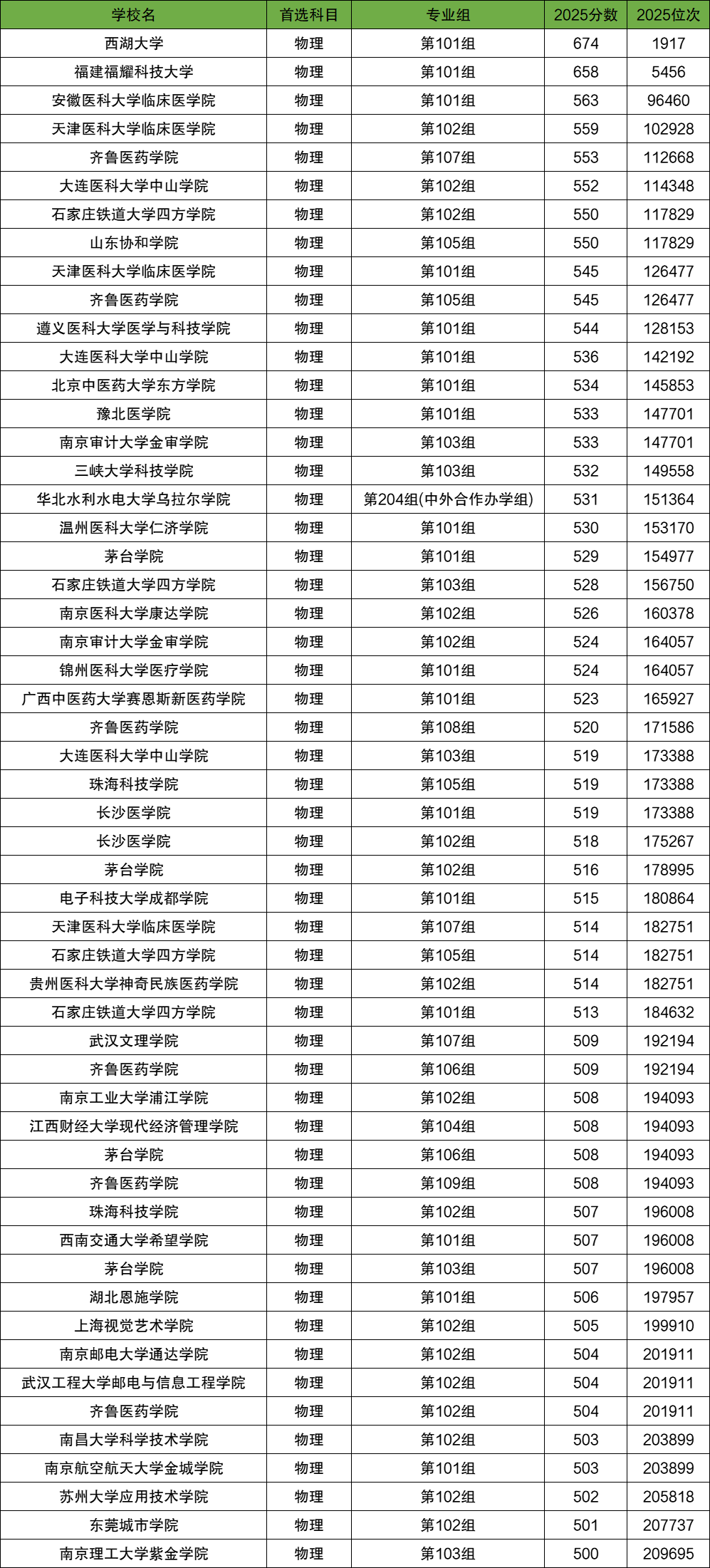 物理类考生可以选择省内的22所民办本科高校,分数线最高的是豫北医学院第101组,录取分数为533分,最低位次是147701。郑州商学院第201组(中外合作办学组)的网络工程专业是最好考的一所大学,2025年分数线为427分,最低位次是348358。