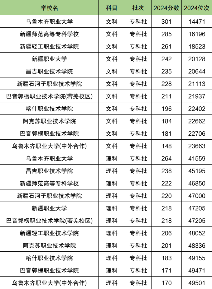 2025年新疆前十名专科大学在新疆文科招生分数线在301分~148分之间,最低位次在14471~23663名。如新疆职业大学最低242分、乌鲁木齐职业大学最低301分、阿克苏职业技术学院最184分。