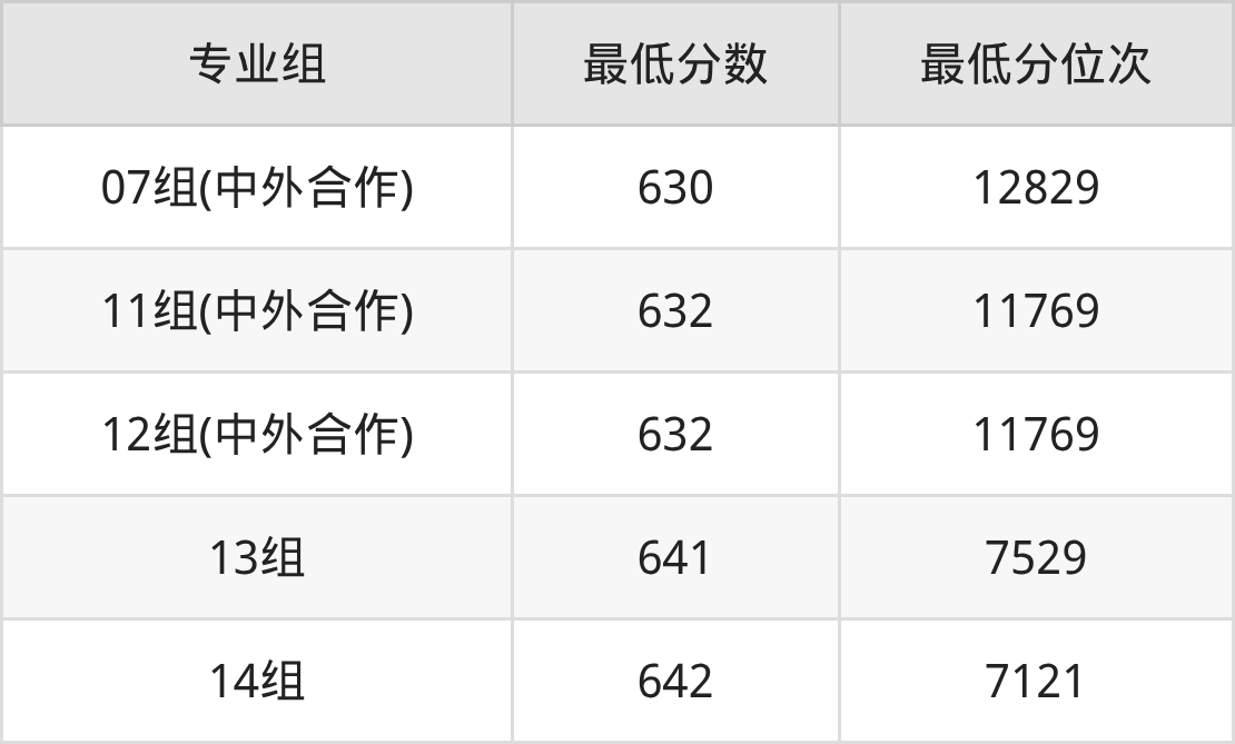 (10)哈尔滨工业大学:03组(中外合作)录取分是628、位次是13915,05组(中外合作)录取分是635、位次是10262,02组(中外合作)录取分是639、位次是8362,07组(中外合作)录取分是640、位次是7928,06组(中外合作)录取分是642、位次是7121