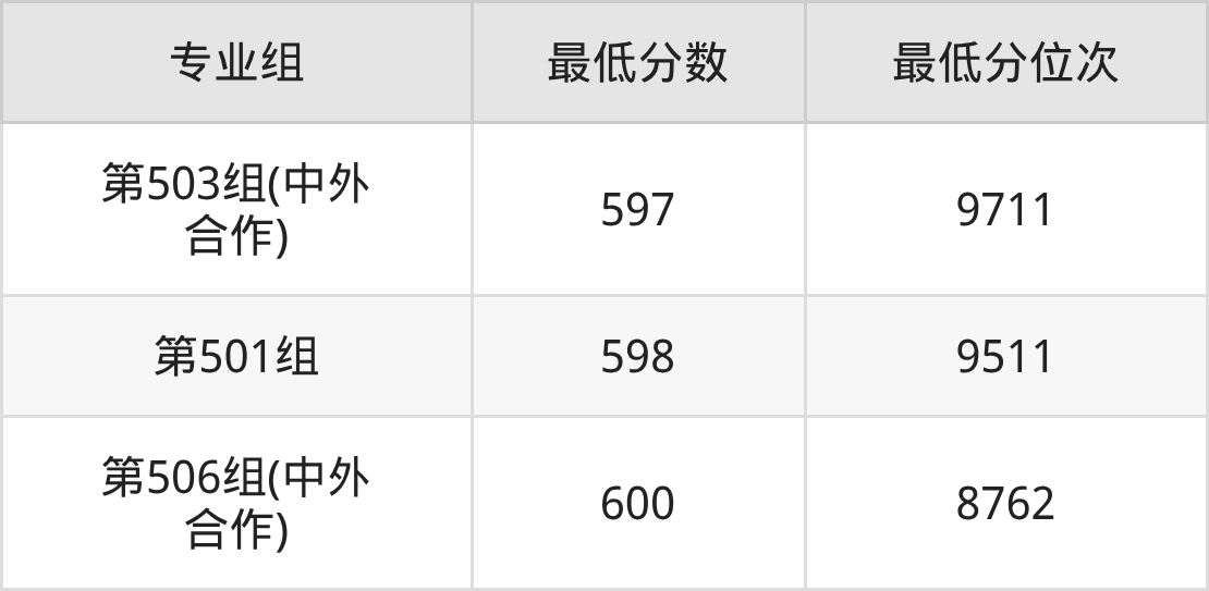 (8)哈尔滨工业大学:第502组(中外合作)录取分是598、位次是9437,第507组(中外合作)录取分是598、位次是9342,第501组(中外合作)录取分是607、位次是6647,第506组(中外合作)录取分是607、位次是6783,第505组(中外合作)录取分是610、位次是6070