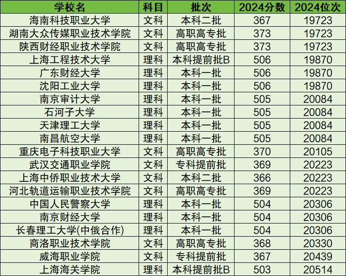 内蒙古文科2万名左右对应的大学有海南科技职业大学(19723名)、重庆电子科技职业大学(20105名)、武汉交通职业学院(20223名)、商洛职业技术学院(20330名)等;